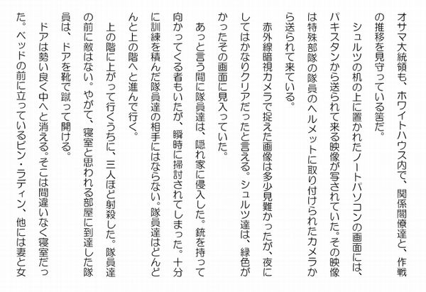 この作品はフィクションであり実在の人物団体等とは一切関係ありません。Copyright(C) 2008-2011 Kazuo KAWAHARA All rights reserved. スレイマンは、その時、単に近くでパキスタン軍などのヘリの墜落事故が起きたのだろうくらいにしか思わなかった。特別の隠れ家に住んでいるラディンが殺されるなど全く頭の中にない。スレイマンは、墜落現場は相当に近くかも知れないが、現にラディンがこうして無事で話をしているのだから特に問題は無いに違いないと思っていた。「スレイマン。連絡有難う。ファイアリア・タワー爆破計画の成功を祈っているぞ。それでは、またな。タワーが崩れ落ちるのをCNNで観るのがを楽しみだ」「はあ、畏まりました。それでは、朗報をお待ち願います」 スレイマンはそれでラディンとの通話を切った。 これがラディンとの最後の会話になった。 ファイサリア・レジデンスのシュルツの部屋では、シュルツ、使用人のサイード、元FBIで今はCIAに属しているシュミット、それに、警察庁から派遣されている隼人達が、固唾を呑んで、ビン・ラディン襲撃作戦の推移を見守っていた。オサマ大統領も、ホワイトハウス内で、関係閣僚達と、作戦の推移を見守っている筈だ。 シュルツの机の上に置かれたノートパソコンの画面には、パキスタンから送られて来る映像が写されていた。その映像は特殊部隊の隊員のヘルメットに取り付けられたカメラから送られて来ている。 赤外線暗視カメラで捉えた画像は多少見難かったが、夜にしてはかなりクリアだったと言える。シュルツ達は、緑色がかったその画面に見入っていた。 あっと言う間に隊員達は、隠れ家に侵入した。銃を持って向かってくる者もいたが、瞬時に掃討されてしまった。十分に訓練を積んだ隊員達の相手にはならない。隊員達はどんどんと上の階へと進んで行く。 上の階に上がって行くうちに、三人ほど射殺した。隊員達の前に敵はない。やがて、寝室と思われる部屋に到達した隊員は、ドアを靴で蹴って開ける。 ドアは勢い良く中へと消える。そこは間違いなく寝室だった。ベッドの前に立っているビン・ラディン、他には妻と女の子がいた。 隊員は女の子を素早く脇に押しのけるが、妻はラディンを庇って前に立ち塞がった。間髪を入れずに、隊員は妻の足を撃ち抜いた。堪らず妻は床に崩れ落ちる。後は簡単だった。 隊員はラディンの左目を撃ち抜くと、ラディンはベッドの脇にどうと倒れた。その隊員は倒れたラディンの胸に止めの一発を撃ち込んだ。辺りは一瞬にして血の海だった。 シュルツ、シュミット、そして使用人のサイードは、小躍りして喜んでいた。「やった。やったぞ。終にやったぞ」 シュルツとシュミットは抱き合って喜んでいる。サイードはどこからともなく、アメリカ国旗を取り出して、振っている。隼人達は、目の前の惨状を見ていると、とても、そんな気にはなれなかった。不憫な気さえしていた。 隼人は、目には目を、決して黙ってはいない、ヤンキー魂、九・一一以来ずっと溜まっていた怨念の爆発を見たような気がした。