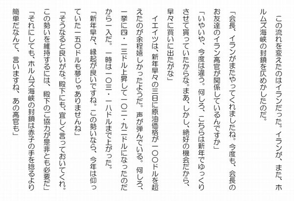 この作品はフィクションであり実在の人物団体等とは一切関係ありません。Copyright(C) 2008-2011 Kazuo KAWAHARA All rights reserved. この流れを変えたのはイランだった。イランが、また、ホルムズ海峡の封鎖を仄めかしたのだ。 「会長、イランがまたやってくれましたね。今度も、会長のお友達のイラン高官が関係しているんですか」「いやいや、今度は違う。何しろ、こちらは新年でゆっくりさせて貰っていたからな。まあ、しかし、絶好の機会だから、早々に買いに出たがな」 イエイツは、新年早々の三日に原油価格が一〇〇ドルを超えたのが余程嬉しかったようだ。声が弾んでいる。何しろ、一挙に四・一三ドル上昇して一〇二・九二ドルになったのだから一入だ。一時は一〇三・一八ドルまで上がった。「新年早々、縁起が良いですね。この勢いなら、今年は仰っていた一五〇ドルも夢じゃありませんね」「そうなると良いがな。殿下にも、宜しく言っておいてくれ。この勢いを維持するには、殿下のご協力が是非とも必要だ」「それにしても、ホルムズ海峡の封鎖は赤子の手を捻るより簡単だなんて、言いますね、あの高官も」「うんうん、そうだな。思わず笑ってしまった。あれはな、日本で良く使われている表現だそうだ」 イエイツは博識なところを仄めかした。「そうですか。会長は、博識ですね。極東の国のことまで。もともと何でも良くご存知ですが」 イブラヒムは、新年早々だから、リップサービスのつもりだった。心底、そう思っている分けではない。心の内では、こんなところも控えめだったブラウン前会長とは異なるなどと思っていた。「いやいや。実はな、ほら、わしの知っている高官から聞いたんだ。何でも、発言したあの高官は、元日本大使館に勤務した経験があったそうだ」「なるほど。そうでしたか。あのテレビ報道を見て、日本でよく言われていることだなどと気のついた人は殆どいなかったことでしょう」「そうだろうな」 イエイツは、自慢気だった。そんなことでもご機嫌だ。しかし、原油価格が新年早々急上昇したことが、上機嫌の主因であることは間違いがない。 「大使、イランには本当に困ったものですね」 アメリカの先物問題を検討している石油関係の委員会で相変わらず委員を務めている植木は、久し振りに会った林大使と歓談をしていた。「そうですね。あの国には梃子摺らされます。もっとも、いつもあんな調子ですから、私などは馴れてしまっていますが」 林は、在サウジアラビア大使館で公使をしていた時に同じ時期にファイサリア・レジデンスに住んでいた植木と知り合った。池波慎太郎とは、外務省の同期で、たまたま、慎太郎がリヤド勤務の時にサウジ勤務となった。この時、植木は、慎太郎から林を紹介された。林はエネルギー問題を担当していたこともあってエネルギーには造詣があった。そして、リヤド赴任時には、石油省のサウジ高官とも付き合わなければならなかったので、自然と、石油にも詳しくなっていた。「真面目に考えれば、腹が立ちますけどね」