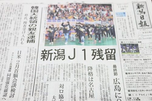 昨夜、突如PCが動作しなくなりましたモニターに何も映らなくなり何をしても動かない今朝、メーカーのトラブル対応窓口に電話しその指示に従って操作をすると・・・何という事でしょう、見事に復活いたしました。とりあえず、ホッと胸をなでおろしました同じようにホッと胸をなでおろした事が有りました。それは「アルビレックス新潟」の一部残留。残留か降格かわからない状況での最終戦ホームゲーム。相手は広島、同じく降格争いをしていた名古屋は降格が決まっている湘南との一戦。とても厳し状況でした。結果はご存知の通り、新潟も名古屋も敗戦。勝ち点は同じで得失点差で辛くも新潟は残留。他力本願ではありましたが、首の皮一枚で踏みとどまりました。新潟駅前では号外も配られたとの事で新潟市民はホッと胸をなでおろした事でしょう。翌日の地元紙の一面は、もちろん残留の記事。我が家でも家族全員帰宅後の第一声は「残留したね!」。ここ何年かスタジアムに行っていませんでしたがやっぱり気になる存在で有る事は間違い無し。そう言えば、今は亡きカプとこんな写真を撮って応援していな~。この残留はカプも喜んでいる事でしょうもちろん跡を継ぐチョコも応援してますよ。でもチョコは言います「来シーズンはもっと上の順位で戦って欲いな~」本当にそう思います。最後に、今回降格となってしまった名古屋グランパス。1シーズンでJ1に戻ってくることを信じています。