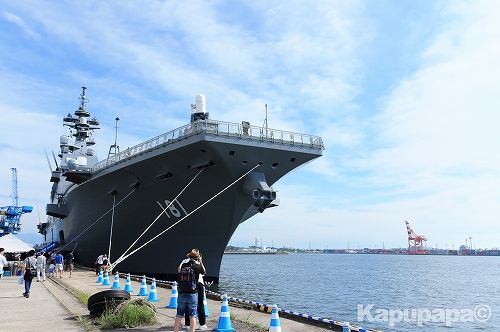 連日、猛暑が続いていますね。各メディアでも熱中症に対する注意喚起をしております。適切な水分補給を心がけたりして十分注意しましょう。今、私の住む新潟市では「海フェスタ」という新潟港が幕末の日米修好通商条約による開港五港の一つとして海外に向けて開港してから150年という事を記念イベントが7月29日まで開かれています。7月16日の海の日に、イベントの一つである海上自衛隊の護衛艦「ひゅうが」の見学に出かけました。第一印象は「でかい!」この「ひゅうが」は全通甲板を有するヘリコプター搭載護衛艦で海上自衛隊では2番目に大きいとの事。でも、この船は一般的な護衛艦と違い、空母の形態ですね。艦内に入ると案内に従い「航空機用エレベーター」で上部甲板に出ます。このエレベーターは意外に静かでスムーズに上昇して少々驚き。上部甲板に出ると巨大なブリッジが目に入ります。色々見て回っていると「まもなく上空にブルーインパルスが飛来いたします」とのアナウンスが入りました。しばらくすると艦首側の上空に、その姿を捉えることができ見事な6機編隊がスモークを出しながら通過して行きました。見事な編隊飛行を見せてくれて、思わず「かっこいい!」と言ってしまった。一緒に行った嫁さんも「かっこいいね!」との喜びの声を上げておりました。大きいレンズで性能の良いカメラなら、もっと良く撮れたのでしょうが私の所有するレンズとカメラでは、これが限界です。ブルーインパルスを見送った後も見学をして下船。今度は艦尾から見てみましたこのアングルも中々好きかも?客船には無い機能美の良さが有ると思います。普段見る事のできない護衛艦を見学でき、「ブルーインパルス」を見る事が出来て充実した一日となりました。さて、暑い中のチョコちゃんは・・・家の中の色々な所で行き倒れております「暑い~、何もする気がニャイわ」「ねえ、部屋を涼してくれニャイかな~」「早くエアコンをつけてチョーだい!」と訴えております。何を言っているのでしょうか?猫のためにエアコンなんて勿体ない!