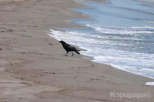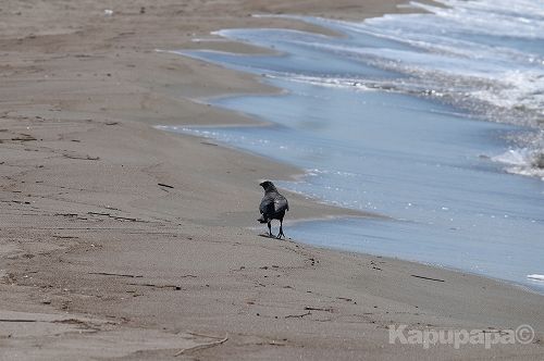 するとカラスは少し離れた波打ち際に降り立ちました。