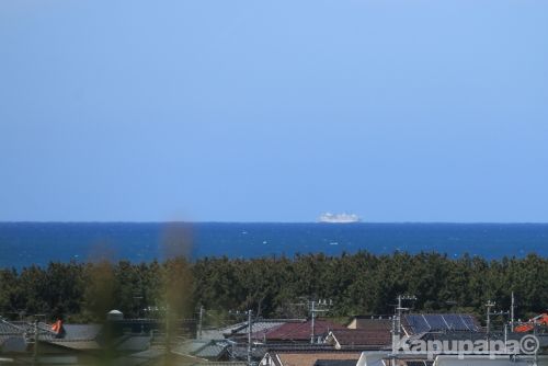 公園から見える海には佐渡島へ向かうフェリーが水平線上に見る