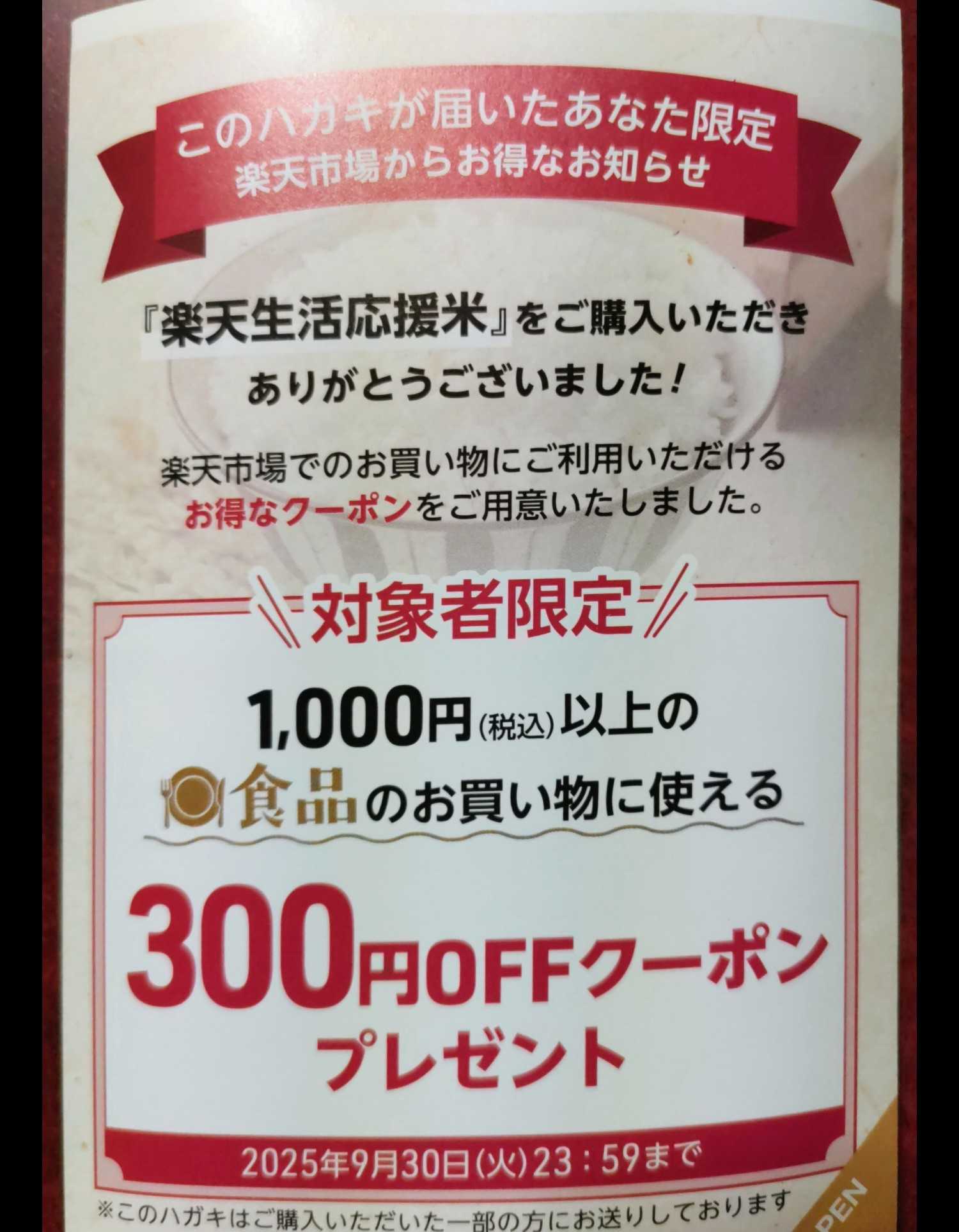 楽天からハガキが。楽天生活応援米(備蓄米)を購入した人限定で1000円以上の食品購入に使える300円引きクーポンでした。でも、なぜメールではなく、わざわざハガキで?楽天生活応援米は契約した1万トンが完売。購入した全員にハガキ送ったんだろうか?何十万って単位じゃないの?クーポンは先着70万人までになってるし。これまで楽天を利用していなかったけどお米のために登録、購入した人たちに向けてアピールするクーポンなのか。いやハガキには「購入した一部の方にお送りしています」ってあるので・・なんでワタシが選ばれたんだろう?2袋購入したから?わからないけど300円引きは大きいのでなんか買っとこう。ハガキ来たけどよく見てなかったって人は確認しておこう。と、昨日に続いて8月の大雨でエントリーを後回しにしていた有名ブランドのポイント山分けキャンペーンのまとめ。8月下旬スタート分。1度にまとまてやると結構時間がかかる・・・宿題と同じでこまめにやっておいた方が・・楽天 パナソニック ドルツ W音波振動ハブラシ 動画視聴後アンケート回答で10万ポイント山分け&お気に入り登録で10万ポイント山分け キャンペーン~2026年2月2日(月)09:59楽天 パナソニック|ラムダッシュ パームイン 動画視聴後アンケート回答で10万ポイント山分け&お気に入り登録で10万ポイント山分け キャンペーン~2026年1月9日(金)09:59楽天 Ulike | 動画視聴&アンケート回答で10万ポイント山分け+お気に入り登録で10万ポイント山分け キャンペーン~2025年11月27日(木)09:59楽天 アンファー スカルプD すべてお気に入り登録で5ポイントプレゼント+アンケート回答で10万ポイント山分け キャンペーン~2025年10月2日(木)09:59楽天 サッポロビール お気に入り登録で3ポイントプレゼントキャンペーン~2025年10月24日(金)09:59楽天 Jackery ポータブル電源 動画視聴&アンケート回答で10万ポイント山分け+お気に入り登録で10万ポイント山分け キャンペーン ~2025年11月27日(木)09:59楽天 アキュビュー アンケート回答で10万ポイント山分け&3アイテム以上お気に入り登録で10万ポイント山分け キャンペーン~2025年10月27日(月)09:59楽天 レッドブル アンケート回答で10万ポイント山分け&お気に入り登録で10万ポイント山分け キャンペーン ~ 2025年11月27日(木)09:59楽天 ヘアードライヤーナノケア アンケート回答で10万ポイント山分け&お気に入り登録で10万ポイント山分け キャンペーン~2025年11月27日(木)09:59