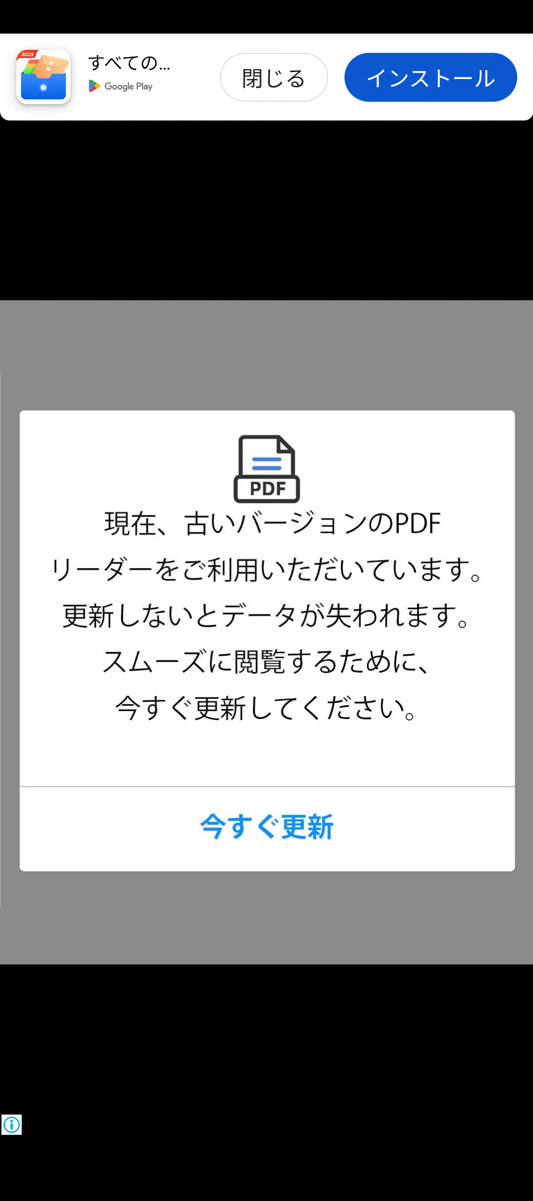 スマホを使っていて突然「PDFファイルが古くなっています。更新してください」といった画面が表示されたことはないでしょうか。てっきりスマホ本体からのメッセージかと思って更新・・・・・・なんて、しませんよ!そもそもファイルを開こうともしていない、楽天スーパーポイントスクリーンでポイント稼ごうと思っていたときに現れてるし。さらにyoutubeを見ようとした時も今度は、わかりやすいです。冒頭に「最終警告」という見慣れた怪しすぎる文言があります。そう、これは公式なものではなく『広告』なのです。実際、PDFファイルは破損していません・・だって使ってないんだから・・そう思わせてアプリをダウンロードさせようという手口です。どんなアプリなのかはわかりません。もしかしたら、しっかりしたものかもしれませんがこのような手法を取っているという段階で、問題外です。この表示は7~8月に多く表示されブログで記事にする予定だったのですが大雨対応ですっかり忘れていて今日になりました。遅れましたがご注意ください。【公式】(最新版)いきなりPDF Ver.12 COMPLETE 【ダウンロード版】 DL_SNR [Windows用][PDF作成・編集ソフト] 送料無料 ソースネクスト PDF作成ソフト PDF編集 PDF PDF編集ソフト価格:9,900円(税込、送料無料) (2025/9/12時点)楽天で購入それでは本物の楽天のポイント情報楽天 アイリスプラザ メルマガ購読で10万ポイント山分け キャンペーン~2025年10月01日(水)23:59楽天 アサヒビール お気に入り登録で10万ポイント山分け キャンペーン~2025年9月30日(火)09:59楽天 資生堂マキアージュ 対象アイテムお気に入り登録で10万ポイント山分け キャンペーン~2025年10月18日(土)23:59こちらも大雨対応で掲載が遅れていましたが今日ようやく追いつきました・・