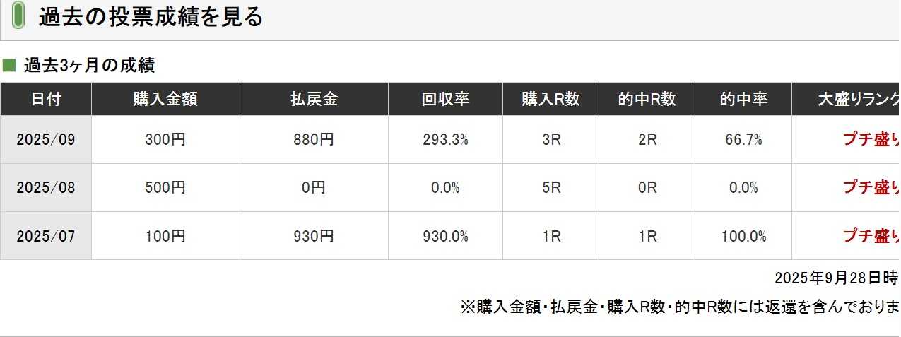 天高く馬肥える秋!!楽天競馬で週末の勝負!そこで起きた奇跡!?楽天競馬 https://keiba.rakuten.co.jp/もうすぐ期限切れになる投票マネー(楽天ポイントをチャージで競馬でしか使えないマネーになります)が300円分あったので馬券3枚購入。その結果なんと!3レース中2レース的中!!やったぜ!ごちそう食える!!・・・・・・・・・あれ?2レース当たったのに払戻金 880円・・・300円買って880円580円の儲けか・・スーパーの弁当だ・・・手堅いところだったので三連複230円650円あわせて880円でした。損はしていない・・?いえいえ、上の3か月分の結果を見てもらうと8月 500円買って 07月 100円買って 930円330円のプラス!・・・いや、3か月以前に1000円つっこんで全滅したりしているので・・・【ふるさと納税】【北海道帯広】世界にたったひとつ!ばんえい競馬 個人冠協賛レース_ 協賛 個人 ばんえい競馬 競馬 希少 人気 おすすめ 送料無料 贈答 ギフト プレゼント 北海道 帯広 【1205457】 楽天で購入 楽天競馬ではチャージしたり購入するとエントリーできるキャンペーンをよくやっているのでポイントを使って参加しています。競馬のことはよくわからないのでAI予想におまかせ。数百円単位なので大きな得もなければ、損も抑えて、ちょっとだけハラハラ楽しむことができます。うまくいけばポイントの現金化も!?出費無しで応募できるキャンペーンも。明日まで。🏆✨ 9/30(火)は白山大賞典! ✨🏆#楽天競馬で白山大賞典フォロリポCP!金沢競馬を応援してQUOカードGET!🔻参加方法1️⃣@rakutenkeiba をフォロー2️⃣この投稿をリポストさらに!#白山大賞典2025 をつけて引用リポストで当選確率2倍!詳細→キャンペーン詳細URL pic.twitter.com/0KbWcri8Z8— 楽天競馬🐎|楽天ポイント貯まる・使える! (@RakutenKeiba) September 24, 2025