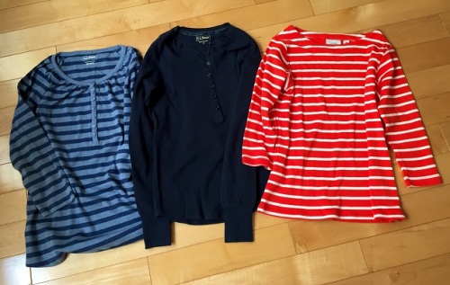 セールで購入したもの、その2は普段着の中でもさらに着る場所限定の家着、定期的に買っているLLビーンのトップスです。着心地のよさと日々の洗濯に耐えられる丈夫さでもう20年以上買っています(笑)最初のころは海外カタログ通販で、その後ネットで買うようになってからもしばらくはアメリカのサイトで、今は1点からでも送料無料だし日本のLLビーンのサイトで買っています。お正月温泉帰りに寄った御殿場のプレミアムアウトレットにも店舗がありましたがアウトレットが広すぎて行く店舗を絞らないととても回れないのでネットでもセールになれば同じような金額でたくさん出るからいいやと何も買わずに帰ってきました。2月になって秋冬ものがかなり安くセールになってきたのでたくさんの中から選んでこの3点をお買いもの↓左からビーンズ・ヘンリー・チュニック、ストライプ ¥2,762が¥1,900ワッフル・ニット・シャツ、ヘンリー(ネイビー) \3,900が¥2,400フレンチ・セーラー・7分丈袖ボートネック ¥4,400が¥2,4003点ともコットン(ワッフルニットのみ2パーセント伸縮素材のポリウレタン混)半額とか70パーセントオフとかに比べると物足りない割引率のようですがLLビーンは定番の商品が多く、その季節になると同じものが定価でまた出るので春と秋、両方使えるものをセールになったときに今までさんざん着てきてへたってきた定番ものをちょこちょこと買い替えるとかなりお得感があるんです。今回は1番割引率が高かった右端の7分丈袖ボートネックがすごく良かったです。着ていて楽で肌さわりも良く、ボートネックとウエストラインがとてもキレイです。コットンで肌触り良く楽な着心地で洗濯に強い、そしてリーズナブル!なのが普段着には何よりでその点ではLLビーンはかなり優秀と思うのですが、サイズ選びは試着しないと難しいかもしれません。私はもうずっと買っているのでこの素材、このデザインならこれかなとわかりますが今回もビーンズ・ヘンリー・チュニックがXSサイズワッフル・ニット・シャツSサイズ、フレンチ・セーラー・7分丈袖ボートネックがMサイズ、と見事にばらばら!(笑)しかも着用感はヘンリーチュニックのXSサイズが1番ゆとりで7分丈袖ボートネックのMサイズが1番フィット感ありの着用感なんですよね。ジャパンフィット、米国フィット、米国フィットプチ、と、いろんな規格があるからこうなるんですが・・米国フィットを買うことはまずなくて、米国フィットプチ、その場合でもXSかSで充分、ジャパンフィットはSかM、デザインと素材で多少違ってきますが、大雑把にはこれでだいたいOKです。セール3はまだ届いていないんですがラ・バガジェリーの帆布素材のビッグトートをお買いものしました。毎日酷使するのでかなりへたってきた今のジム通い用のトートに変えて使うつもりです。で、バガジェリーを買ったときにふと、いつもエコバッグとしてスーパー用に使っているLLビーンのビッグトートもジム通い用やお稽古ごとの時のバッグにぴったりだなと思いつき、サイトで見たら大きさやデザイン、素材違いでかなりいろいろキャンバストートが出ているので大きさを変えて買おうかなと検討中です。エコバッグとしてスーパー専用で使っているのがこちらのLLビーン ボート・アンド・トート・バッグのエキストララージです。これは20年近くも前にアメリカのカタログ通販で買ったもの。小さい娘を連れて「クルマで」遠くの大きな公園とかアウトドアに行くとき、おもちゃからシートから飲み物から着替えから、とにかく何でもかんでも入れて使っていたものです。「クルマで」と限定なのはトート自体がかなりしっかりした24オンスのキャンバス地である程度重みがある上エキストララージという大きさになんでもかんでも詰め込んだあとの重さがハンパないから(笑)でもそれだけに丈夫さは相当なもので娘が子供時代にさんざん使ってもびくともせず今はスーパーでの買い物に日々活躍。元取れ過ぎるほどの優秀さだと思います。これだけ愛用しているものなのでなんで今まで思いつかなったんだろう?とエキストララージほどの大きさが必要ない場合のトートも1つ買おうかなと今選び中です。