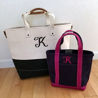 LLビーンで購入したキャンバストート、3月9日にオーダーして届いたのが3月19日、海外通販で2週間くらいと思っていましたがけっこう速かったです。大きいほうのナチュラル×ブラックがNor'Easter Tote、LLビーンの定番トートのエキストララージとほぼ同じ大きさです。セールで70ドルが39.99ドル。持ち手はレザーですごくしっかりした作りです。好きな色でオーダーしたのは定番トートのスモール。ネイビー×ダークフューシャで作りました。44ドルなのですが、割引で35ドルになっていました。セールではないので何かのキャンペーン期間中だったのかな??日本のサイトではなく、アメリカのサイトでの購入なので送料が35ドルかかりますからセールと割引で送料分カバーできてラッキーでした。モノグラムはどちらも1文字で入れました。カスタムは本体、持ち手、底、ポケットの色を自由に指定でき、ページ上でクリックして出来上がりのイメージを見られるのでほぼイメージ通りに出来上がります。うんと派手なバッグを作ってみたり自分では選ばないような色の組み合わせにしてみたりと遊んで見てるだけでも楽しいです。自分の好みの色の組み合わせで作れるのはいいですよね。日本のサイトでもトートバッグのカスタムをやってくれると嬉しいんですけど。そうしたらもっと色違いで大きさも変えてオーダーするのに。大きいほうはしっかりしたキャンバスでこれにぎっしりモノを入れるとさすがにかなり重いのでクルマでドアtoドアのジム通い専用です。2レッスン出る日、ウェアの替え、バスタオル&フェイスタオルも2枚ずつなのでこのくらい大きなバッグのほうが使い易いです。取り外しできる肩掛けもついています。大きいですが内側に大きなポケットが2つ、ファスナー付きポケットが1つついているのでお財布、スマホ、ジムの会員証、クルマのキーなどはここへ。とても便利に使っています。