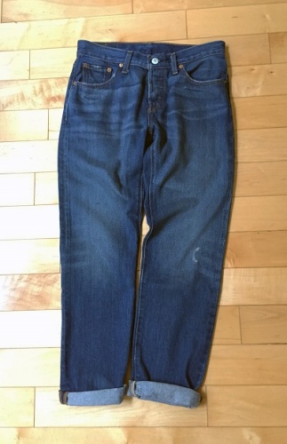 リーバイス501の新作、膝から裾にかけて細くなるテーパードタイプのCTを購入しました。リーバイスの501、前はよく穿くデニムでしたが年とともにもうちょっと女性らしく穿けるタイプのデニムのほうがしっくりくるようになってきてここ数年あまり穿かなくなっていました。新作の501CTはテーパードタイプで今までの501より穿き易いです。ウエスト、ヒップ、モモがゆったりしていて膝から下はほっそり。今までの501より女性らしい感じで穿けると思います。色は、ブリーチカラーは昨年春、レッドカードの細身ボーイフレンドデニムで、ライトカラーはSiwyのクロップドデニムで持っているのでダークユーズドカラーにしました。ブリーチカラーとライトカラーは膝中心に激しくクラッシュが入っているので避けたというのもありますが・・ダークユーズドカラーだけ左膝とバックポケットにちょこっとのおとなしいダメージ。今年はダメージデニムが流行ということですが私は年齢的にもこのくらいのがいいかなと(笑)穿いた感じ、すごく良くて気に入っています。ストンと落ちるシルエットもとてもいい感じです。リーバイスの公式サイトを見ると1~2サイズ小さめサイズにして「スリムなシルエットでモダンに」ジャストサイズで「王道なクラシックスタイル」1~2サイズ大き目にして「リラックス感」とあって「え~?どのサイズも穿けるってこと?」とちょっとびっくり。小さめでも穿けるの?と。実際試着して選ぶと確かにどれも穿けました(笑)まぁ大き目は穿けるでしょうが、小さめサイズでもウエストとヒップがかなりゆるいので可能なんだと思います。私は23がジャストで、ちょっとゆとりをもたせて24サイズにしました。25だとかなり大きかったです。自分の好きなシルエットを選べるのっていいですよね。かなりおススメですよ