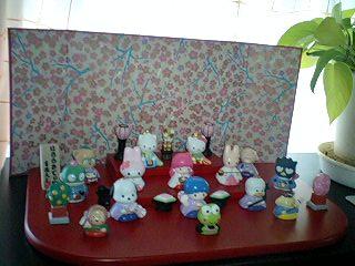 招き猫のお雛様もこの前買ったというのに、結局これも買ってしまいました。 サンリオオールスターキャストのお雛様♪相変わらずお内裏さまはダニエルなんだけど、左大臣にバツまるがいるからいっか~ということで。これならコンパクトサイズなので、ラックの上でもOK。手軽なのですぐ出せる&すぐ片付けられるのも便利。よいものを買いました~♪