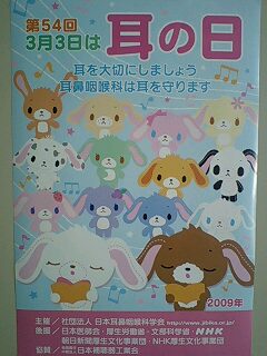 3月3日は『耳の日』だそうで。お耳が自慢(?)のうささんたち大集合です。サンリオのキャラクター『シュガーバニーズ』そうか、彼らはうさぎだったのね。(シュガー”バニーズ”って入ってんじゃん)私の耳は特殊で、よく耳が聞こえなくなっちゃうので、かなり耳鼻科には通っていますが、このポスターにはびっくりしたなあ。皆さんの耳も大切にね。