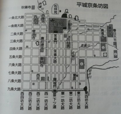 これは「奈良まほろばソムリエ検定」の平成20年1月13日実施の奈良通1級の53番目の問題です。『次の図は平城京の寺院の配置図である。a~dの寺院の組み合わせで正しいのはどれか.ア.a-紀寺 b-新薬師寺 c-大安寺 d-元興寺イ.a-紀寺 b-元興寺 c-大安寺 d-新薬師寺ウ.a-大安寺 b-元興寺 c-紀寺 d-新薬師寺エ.a-大安寺 b-新薬師寺 c-紀寺 d-元興寺 』が問題文で、この図は、その配置図をしめします。さあ、どれが正解でしょう?奈良検定について興味があれば、→こちらもご覧くださいね。