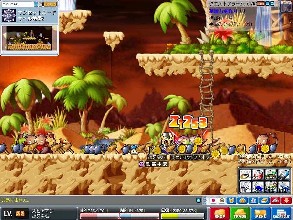 どうも、今日久々にインできましたあ、SSはありません理由は重すぎたのでメイポ一回アンインストールしてそのまま設定変えず気付かないままSSとってたからですすみませんねマッタクなので今日も短めえー今日はかなり前の予告どおりレベルアップ34ですか…盗賊のときでは考えられない速さだ…三倍の速さ(以下略)ですで、暇&ちょっとした目的の為時間沸きの敵へそのモンスとはあれですデブデウです分かりませんね多分あれです分かりやすくいうとサボテンですカツスとかのおじいちゃんバージョンみたいなやつですええ、分かりにくい比喩ですねま、それは置いといて目的というのはドロ狙いです時間沸きなのに無謀ですねけどねそれでもPアイテムに似てる&移動速度+17の片手剣は欲しいでしょ?なんか燃えちゃってる剣ですテラホシスってな感じでレッツゴー時間沸きなのに結構な沸きっぷりほぼ全chいますねそれだけ過疎…=まい・ほーむですてかこの過疎好きはどこから?…もしや蓮sの影響か!?もしくははじょーsで過疎…過疎…でもちょっとすると人がわんさか4,5人きましたで別々のchで陣取ってましたでもそれでもかなり空いてるのでカリカリ全ch倒したのでいろいろやってリターンまたですまたカリカリさっきと同じ人も見かけましたがそれでも人数は減ったちなみに経験値は500いくらかですでカリカリ結局15匹くらい倒しました時間沸きなのに…迷惑千万(漢字違うかもw)ですねま、反省はしていますちょっとねまぁ早い者勝ちですよみたいな感じでいってましたスイマセン調子こいてました反省してますちょっとだけねで、鼻炎から緊急集会の連絡がフリマで緊急集会開始内容?新しいギルドの名前を考えて欲しいとのことま、いろいろ話し合いました結果はまた違う日にでは今日はこれででは~ とりあえず時間沸きモンス乱狩りはやめようかな…ネチケットですね、これからはやめるよう努めるかな…