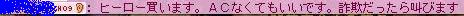 こんにちは、今日も昨日の企画第二弾です!(うわーお…)あぁ…まぁそれは置いといてささっとメイポ------------------------------------------------------------今日もメイポやりましたよそして今日は昨日の記事の終わりで取っておいたお楽しみを昨日ジイに会うと…少し前に100レベ記念であげた書のお返しとして… こんな物をくれましたおいおいジイよ…1つ確か1Mくらいで…10Mじゃないかしかもあげた書の売値が17だか18Mで…儲け少なくなっちゃったじゃないか…なんていいやつなんだ、お前ってヤツは…とまぁジイに感動良いやつなんですよ…ホントにでまぁインしたときの事をインするとこんな拡声器がなんというかっこよさ…COOL!COOL!(何故に英語を…?)おいおい牙突君、常識がなってないなそこは普通「欧米化!」だろう…?知りませんねそんなの怒ってはるなまぁいいあの拡声器が流れた後こんな拡声器がするとさっきの方がこんなものを… でまぁ少し狩っているとレベルアップでございます35になりましたでまぁ外でフラフラしていると鼻炎がイン 普通に挨拶をするとどんな返事をしたのかというと…なんという…最高じゃないかwでまぁその後鼻炎が…叫びました絶賛募集中でこざいますで今日は終了では~