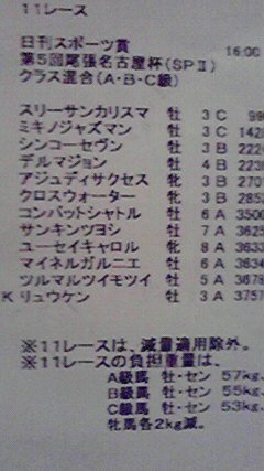 の出走予定表が発表されました! 写真は31日の最終レースのメンバーです。見た瞬間に結構へこみました(T_T) 自厩舎のミキノジャズマンは重賞に挑戦すると言っていたので凄く楽しみしてたのに・・・よりによってツルマル君と一緒だとは(涙) 乗り馬も少なくて、勝つ馬もいないのに一緒のレースに重なると辛いです。ジャズマンは怪我してから復帰初戦に勝たせてもらい思い入れの強い馬です。最近は調教でも手こずるぐらい馬力もよく力試しにはもってこいだなぁと思ってました。でも、自分はツルマルツイモツイに乗ります! 乗るからには、ジャズマンには負けないように頑張ります! ジャズマンも頑張ってほしいですけど、そこは勝負の世界なので(-_-;) 予定なので、まだ決まってませんが重賞を勝てるチャンスはあると思いますのでご声援よろしくお願いしますm(__)m