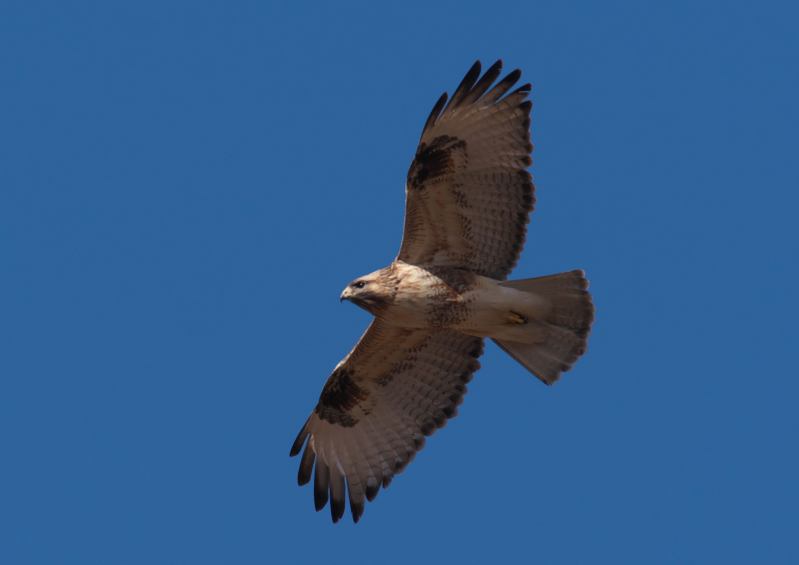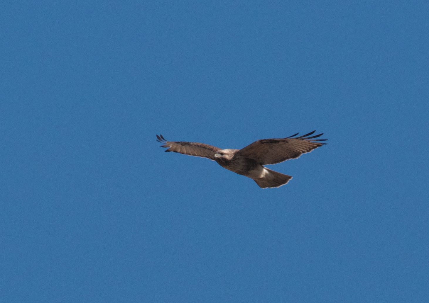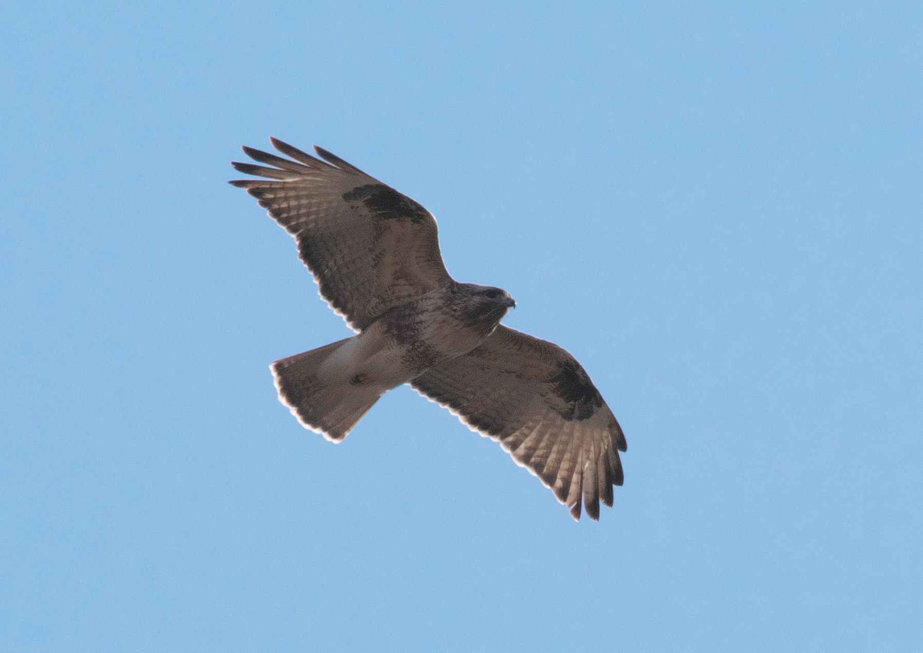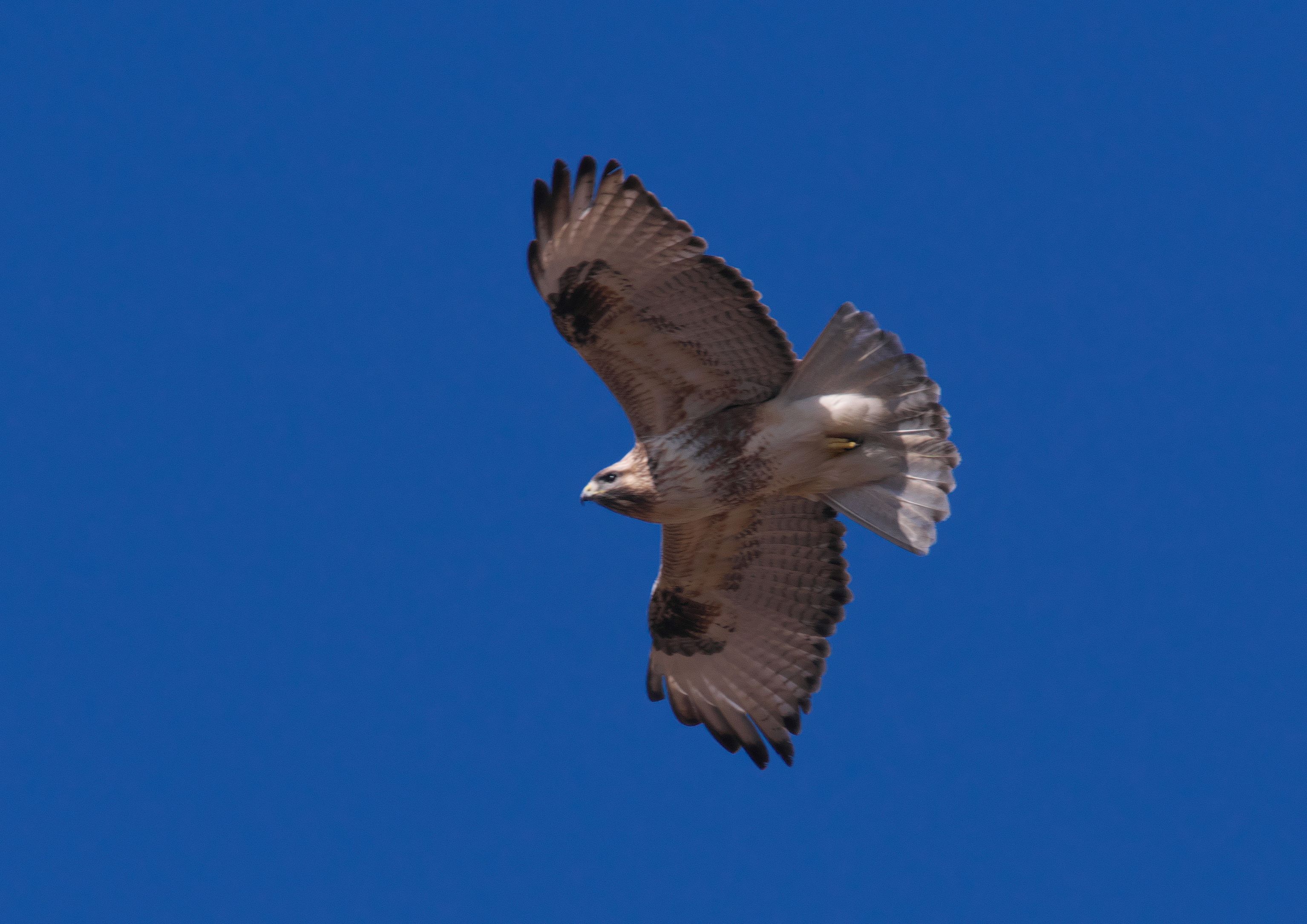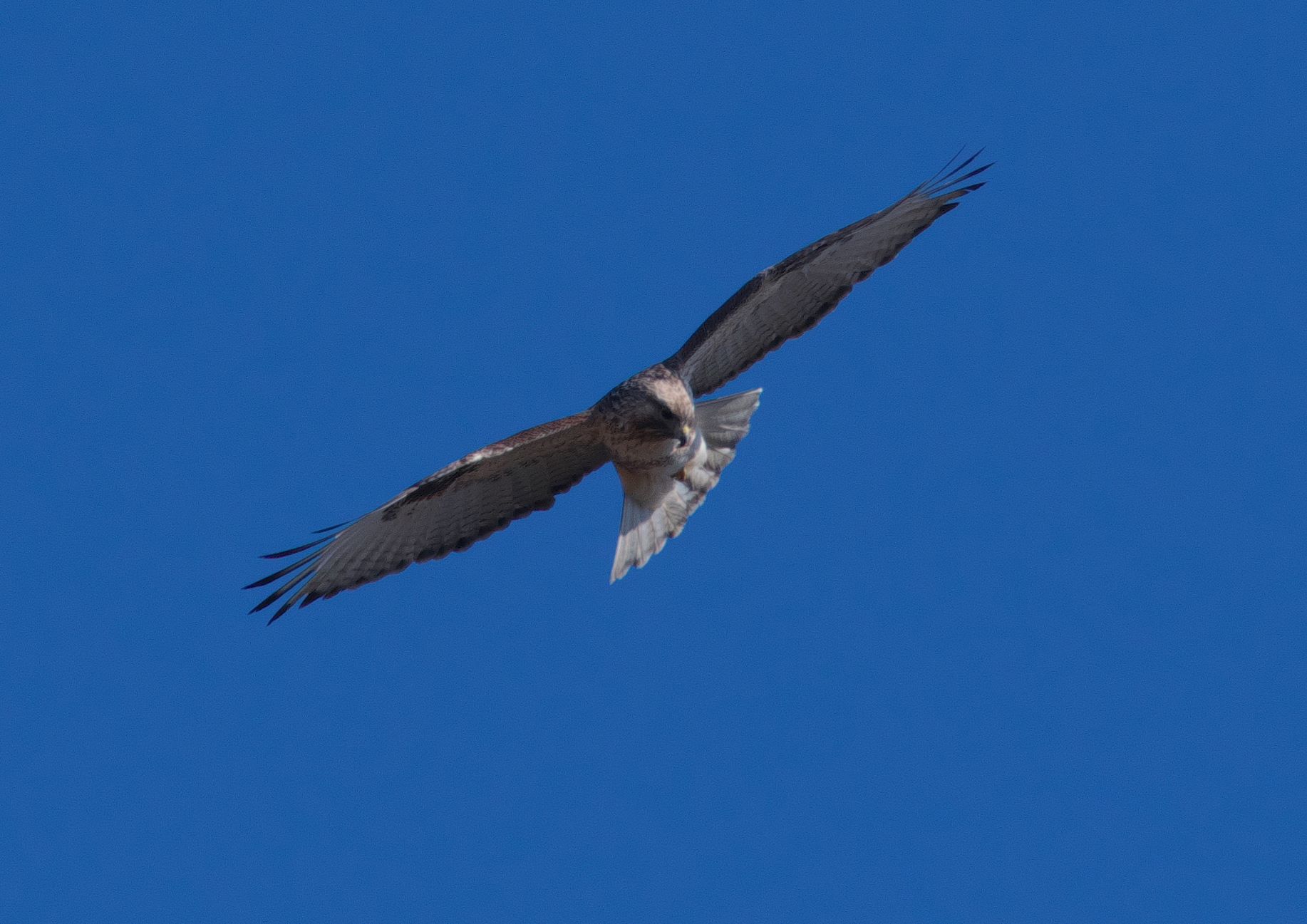 ノスリが近い真上を飛びまわります。背景が入らず青空に映えるノスリとなりました。