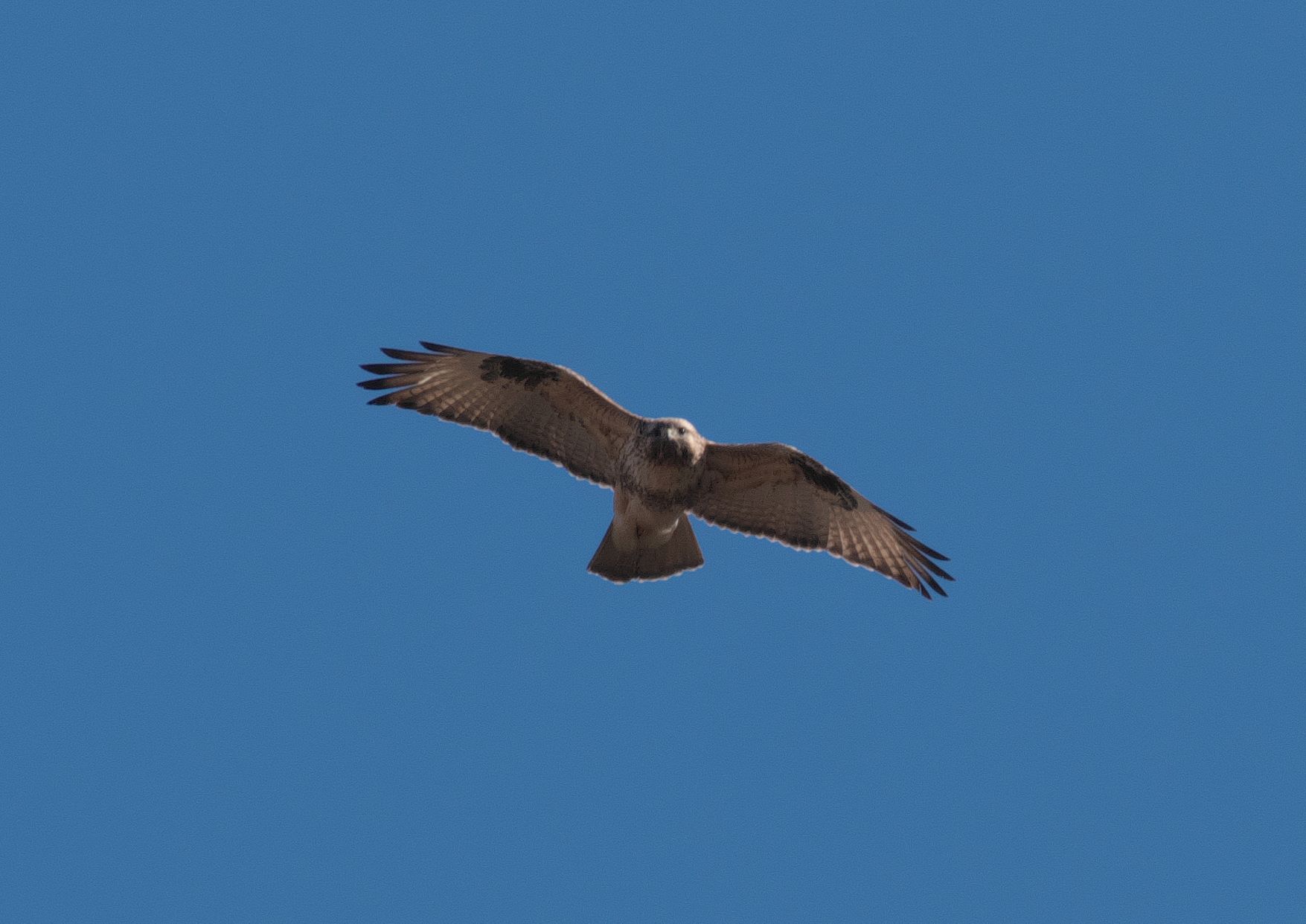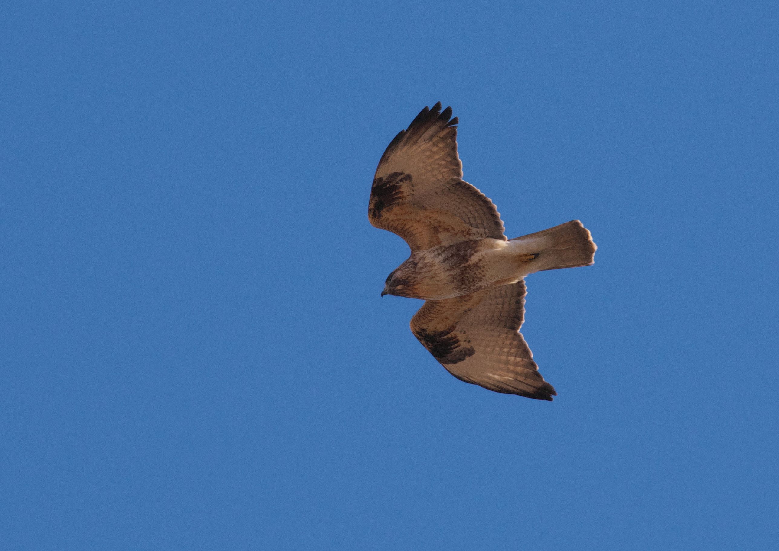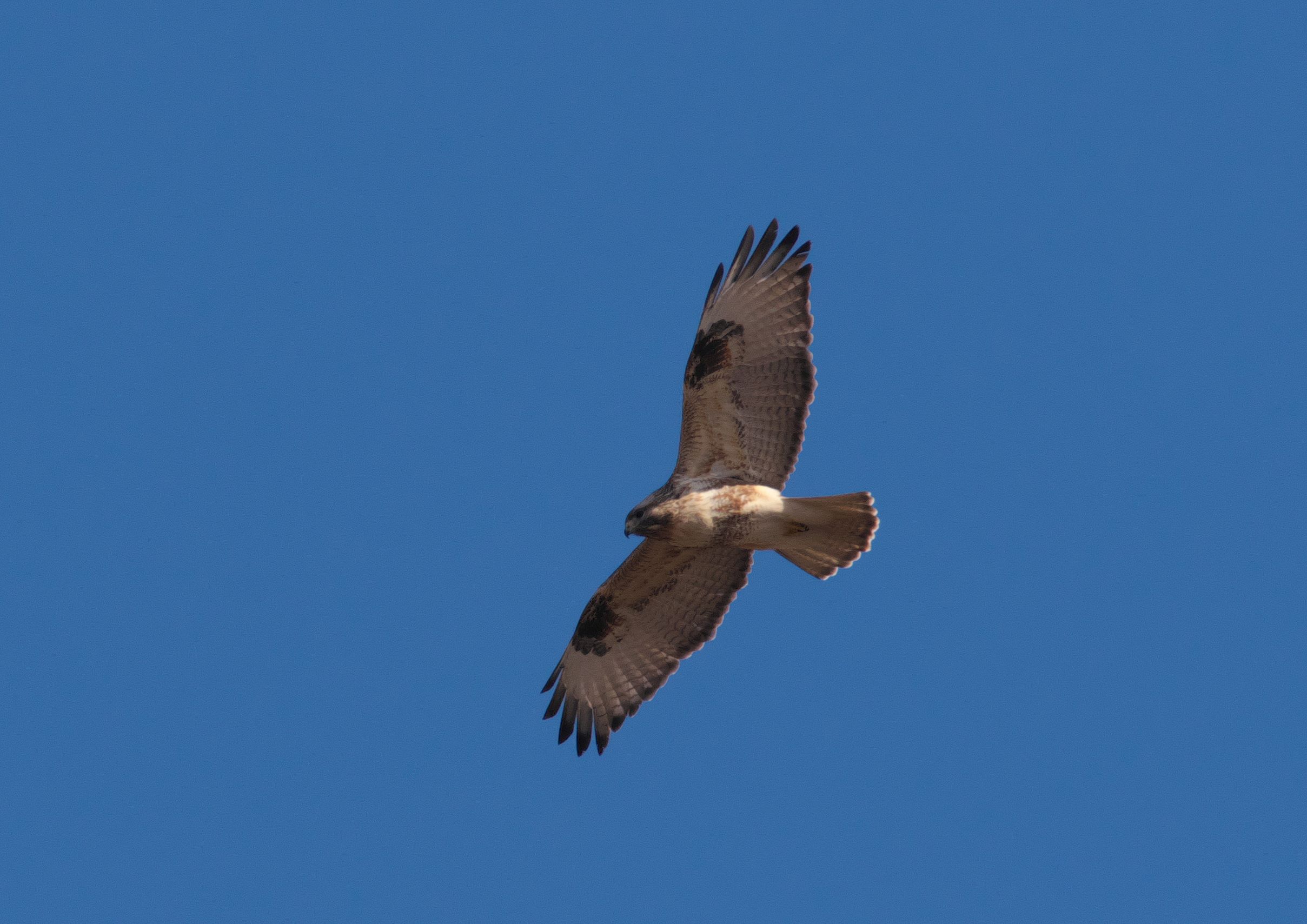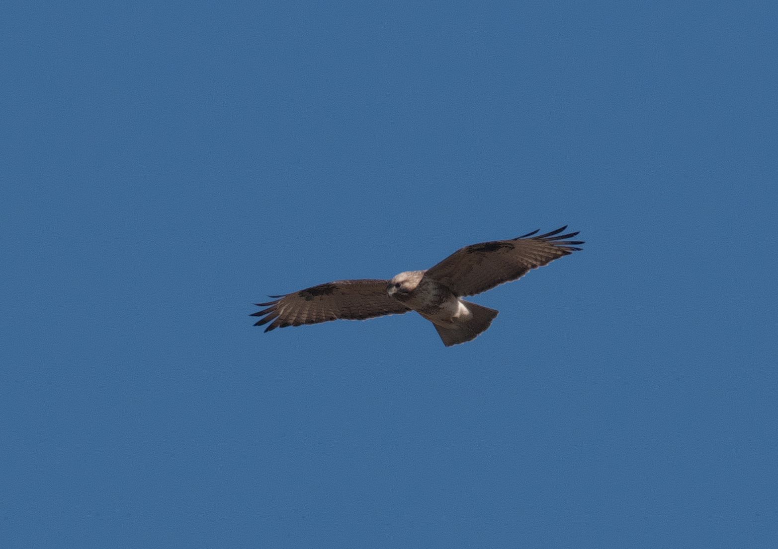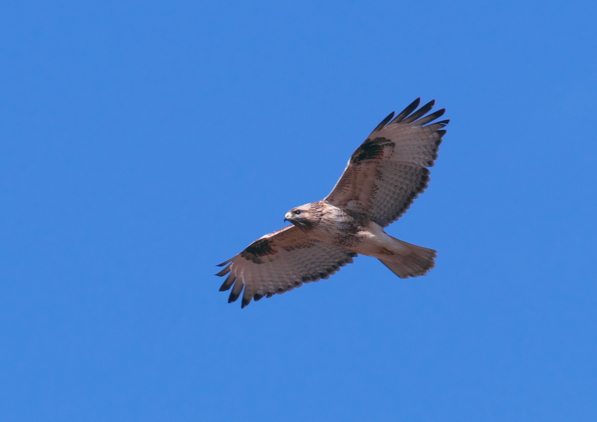 ノスリが近い真上を飛びまわります。背景が入らず青空に映えるノスリとなりました。