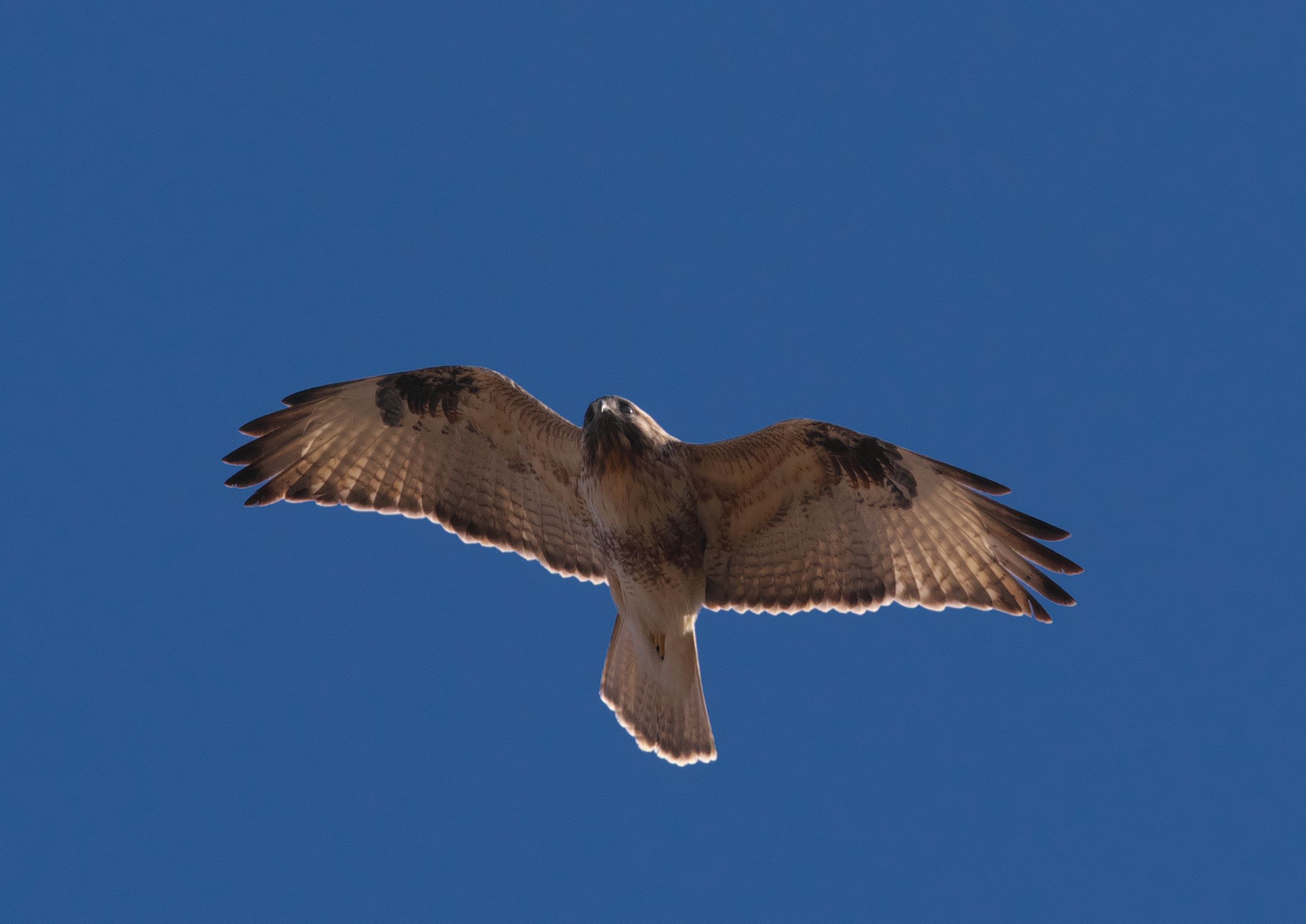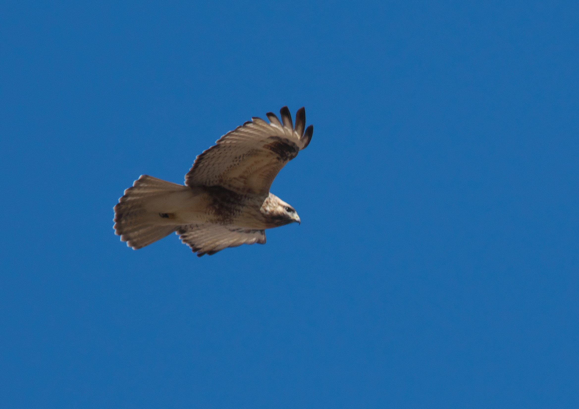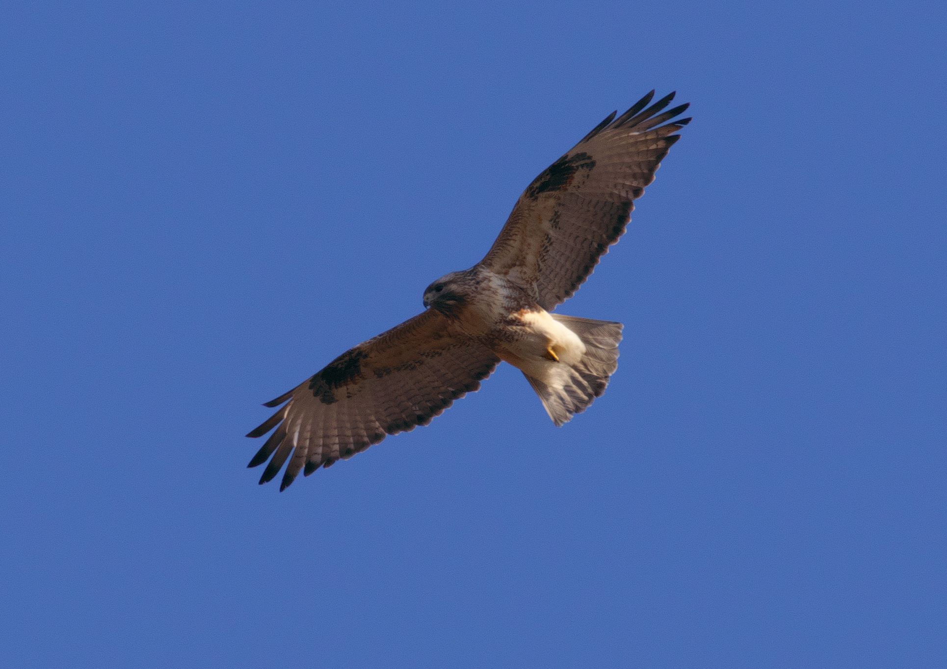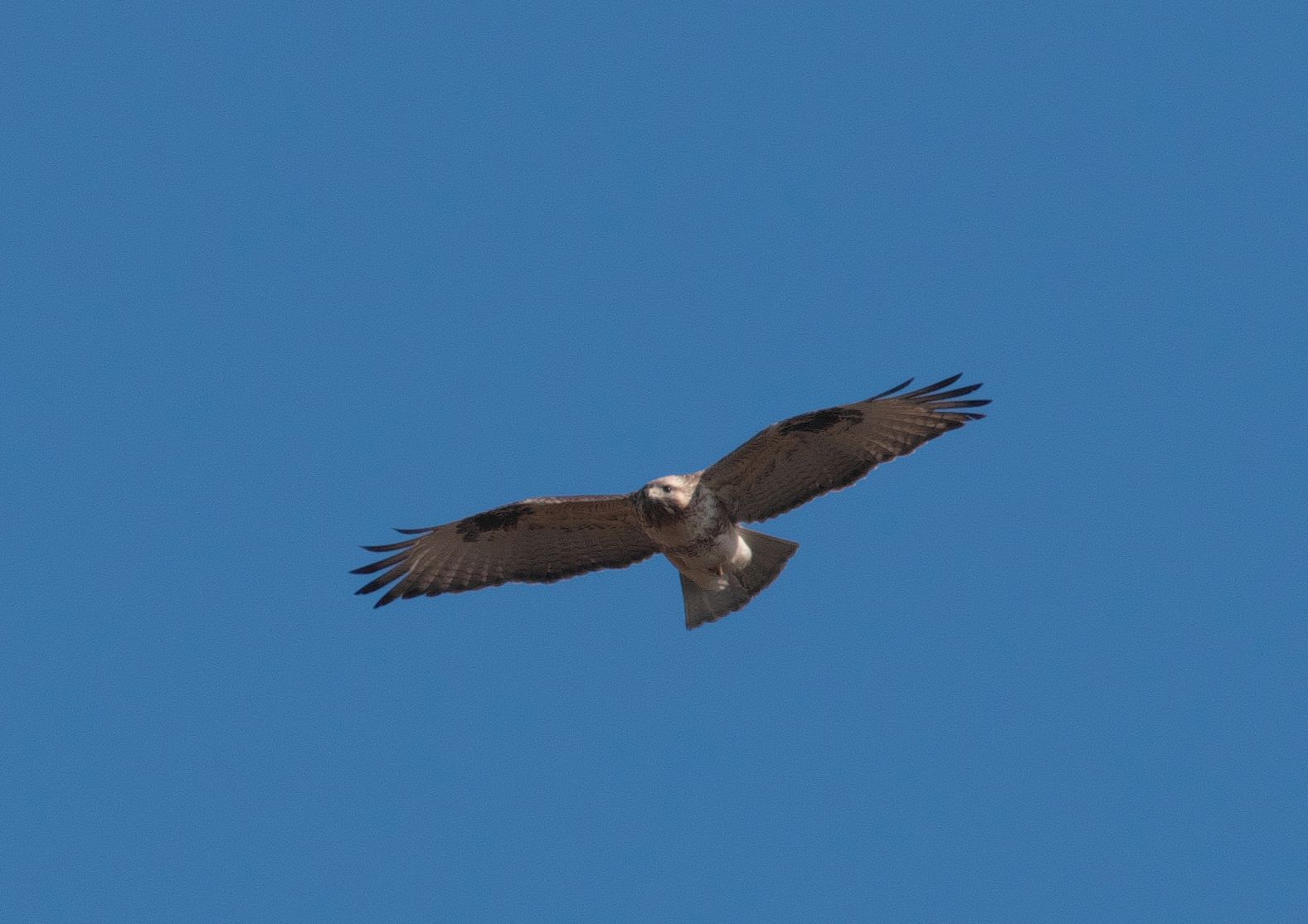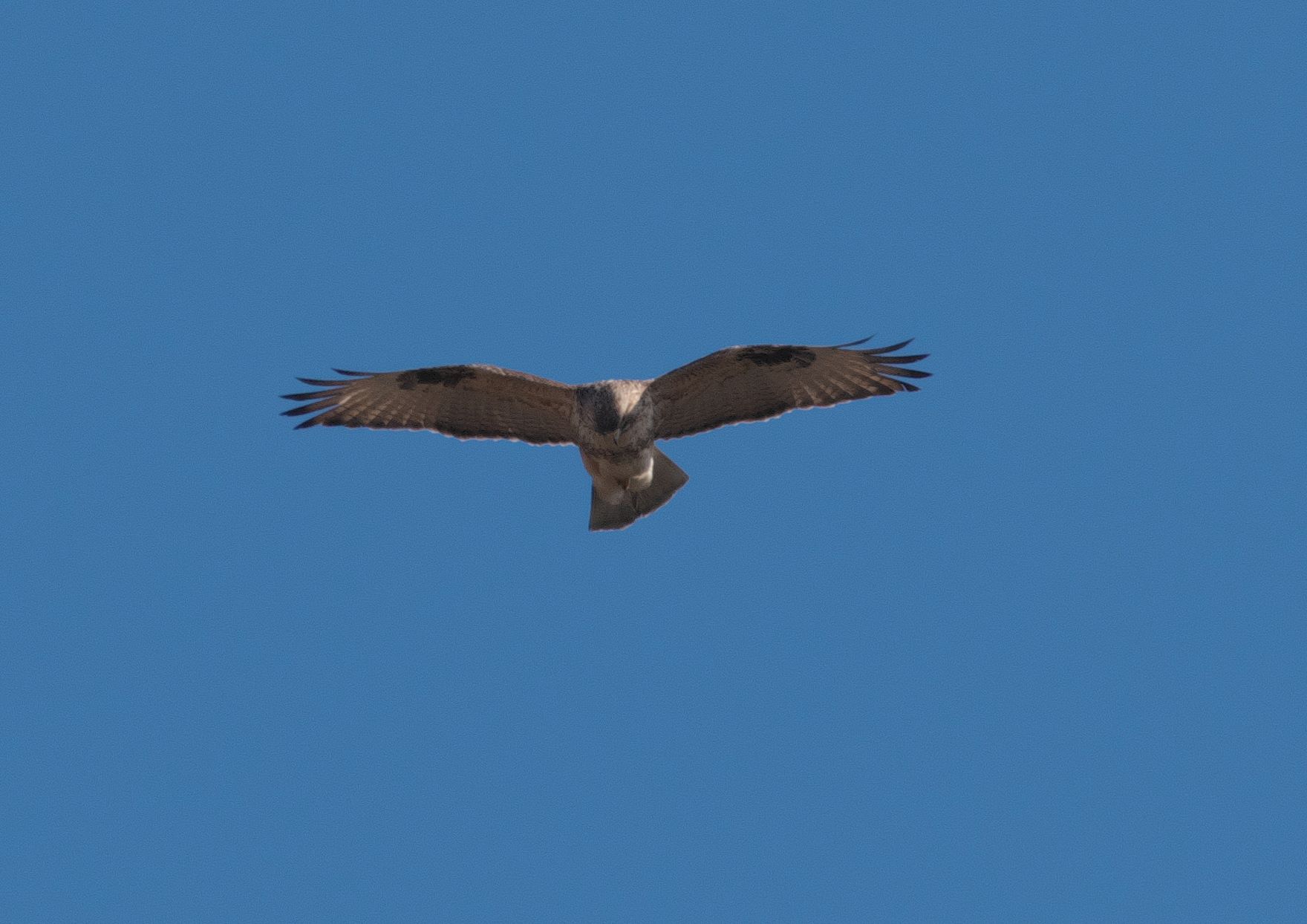 ノスリが近い真上を飛びまわります。背景が入らず青空に映えるノスリとなりました。