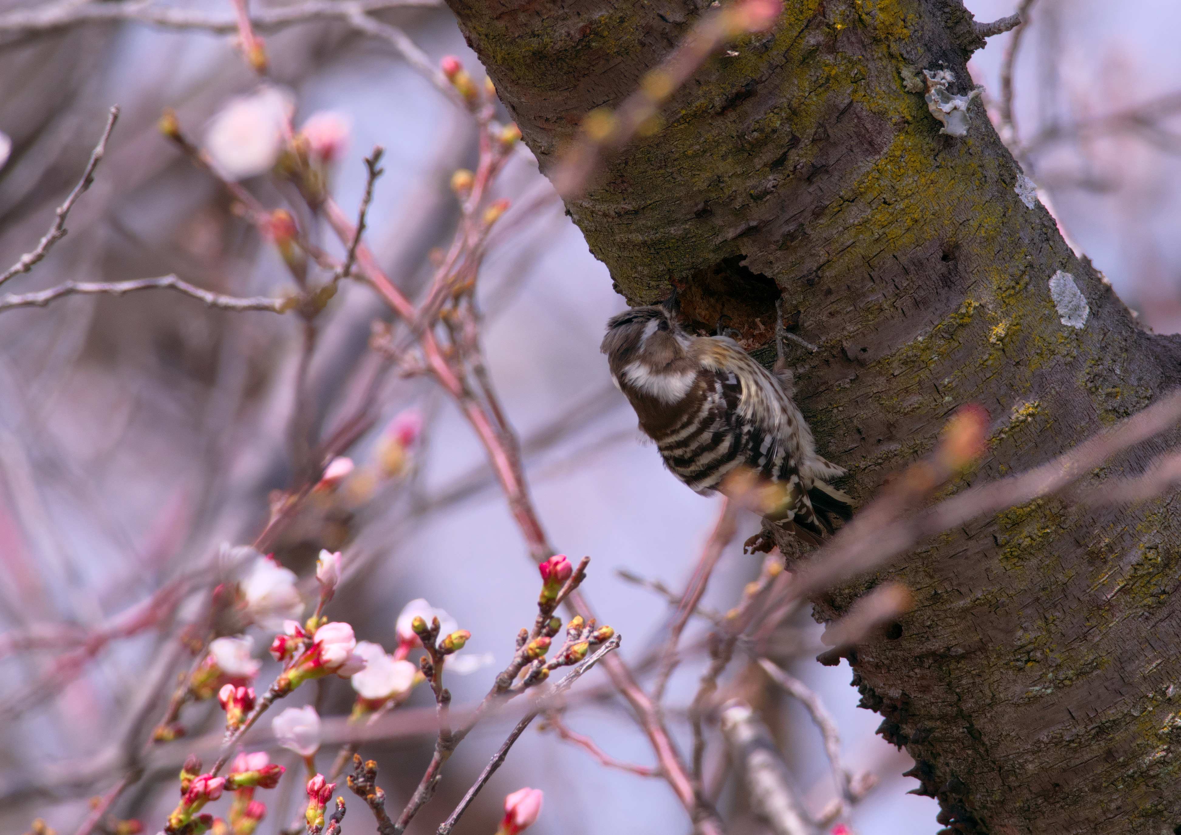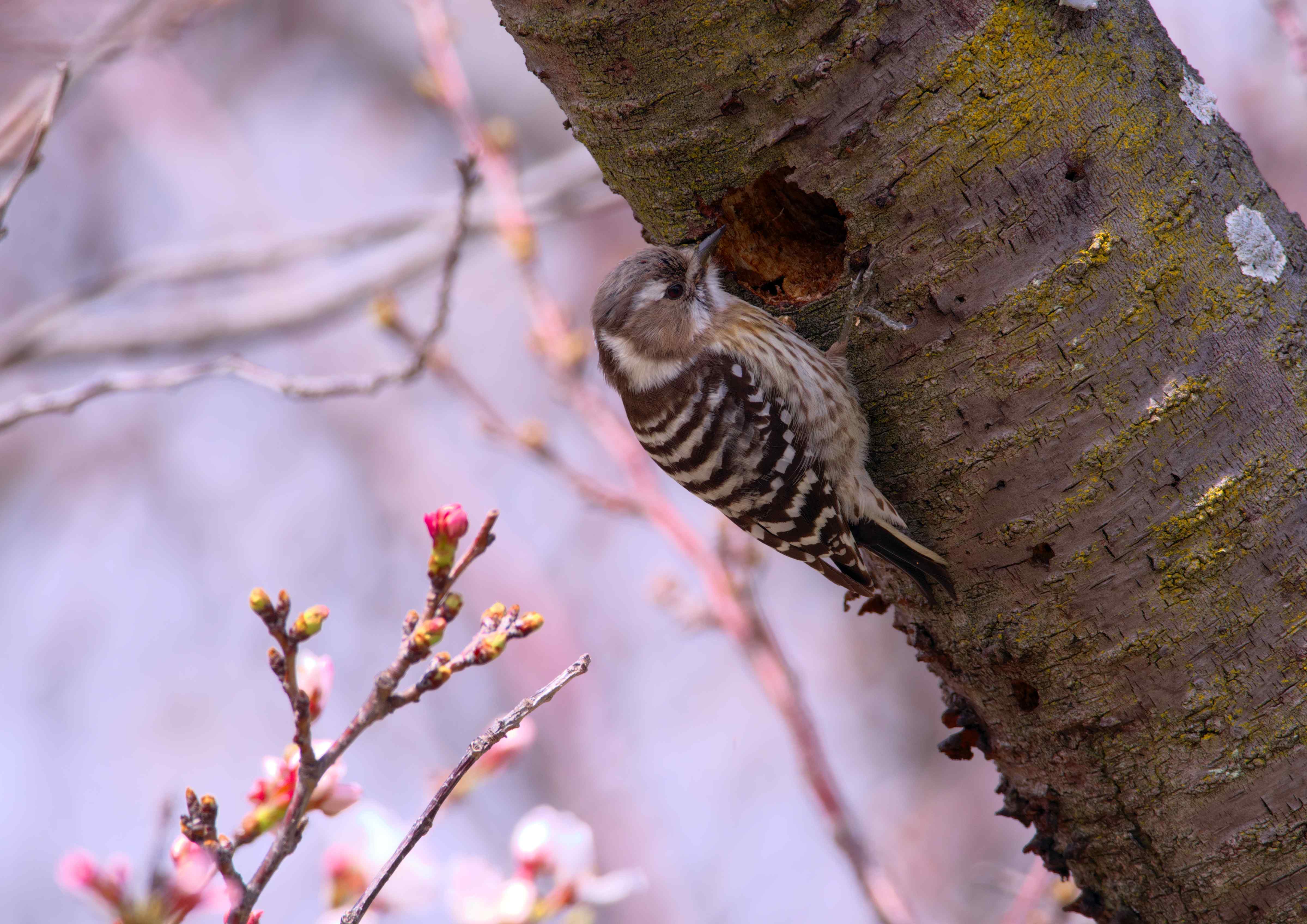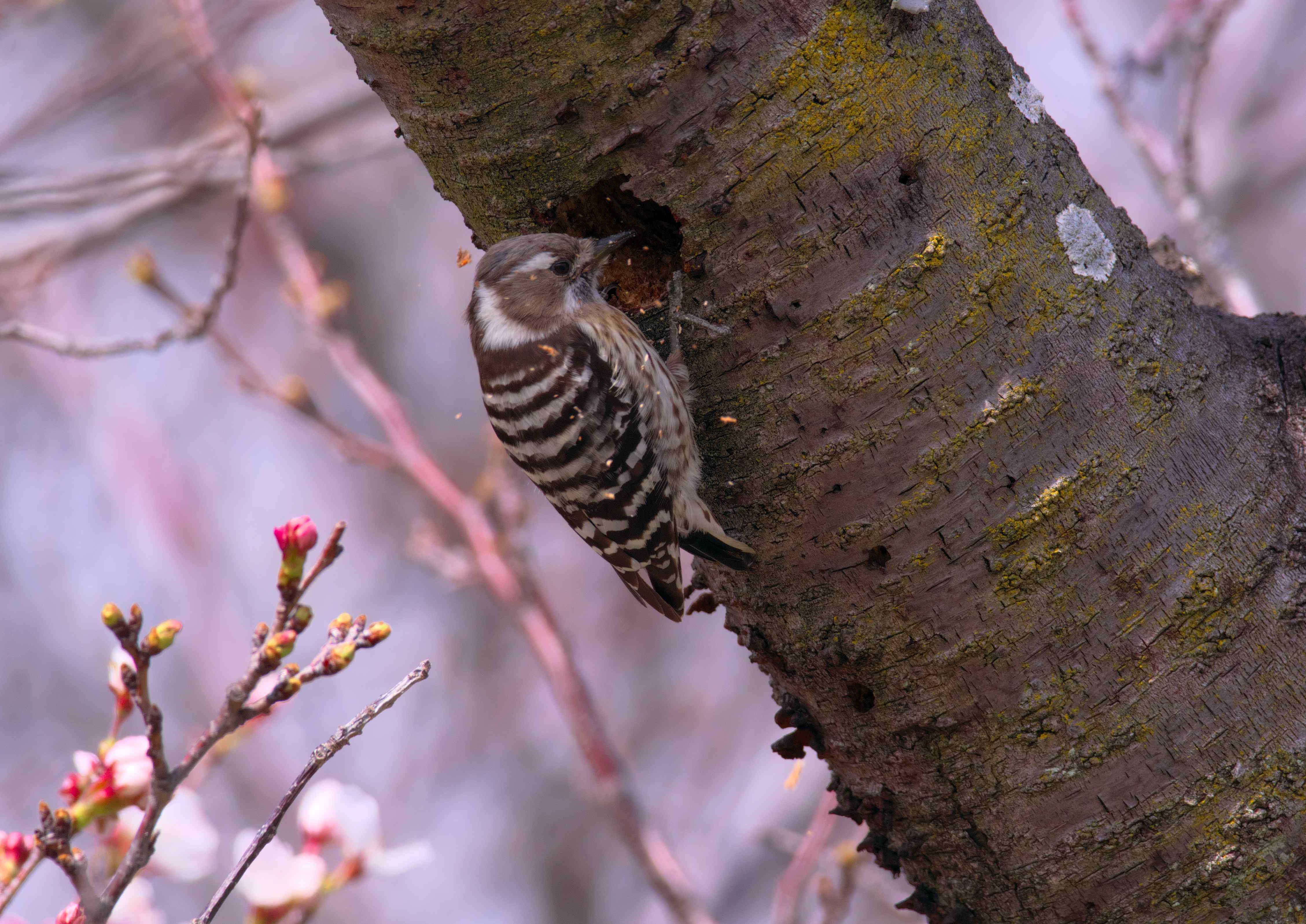 桜の木に突貫工事をしているコゲラを発見。