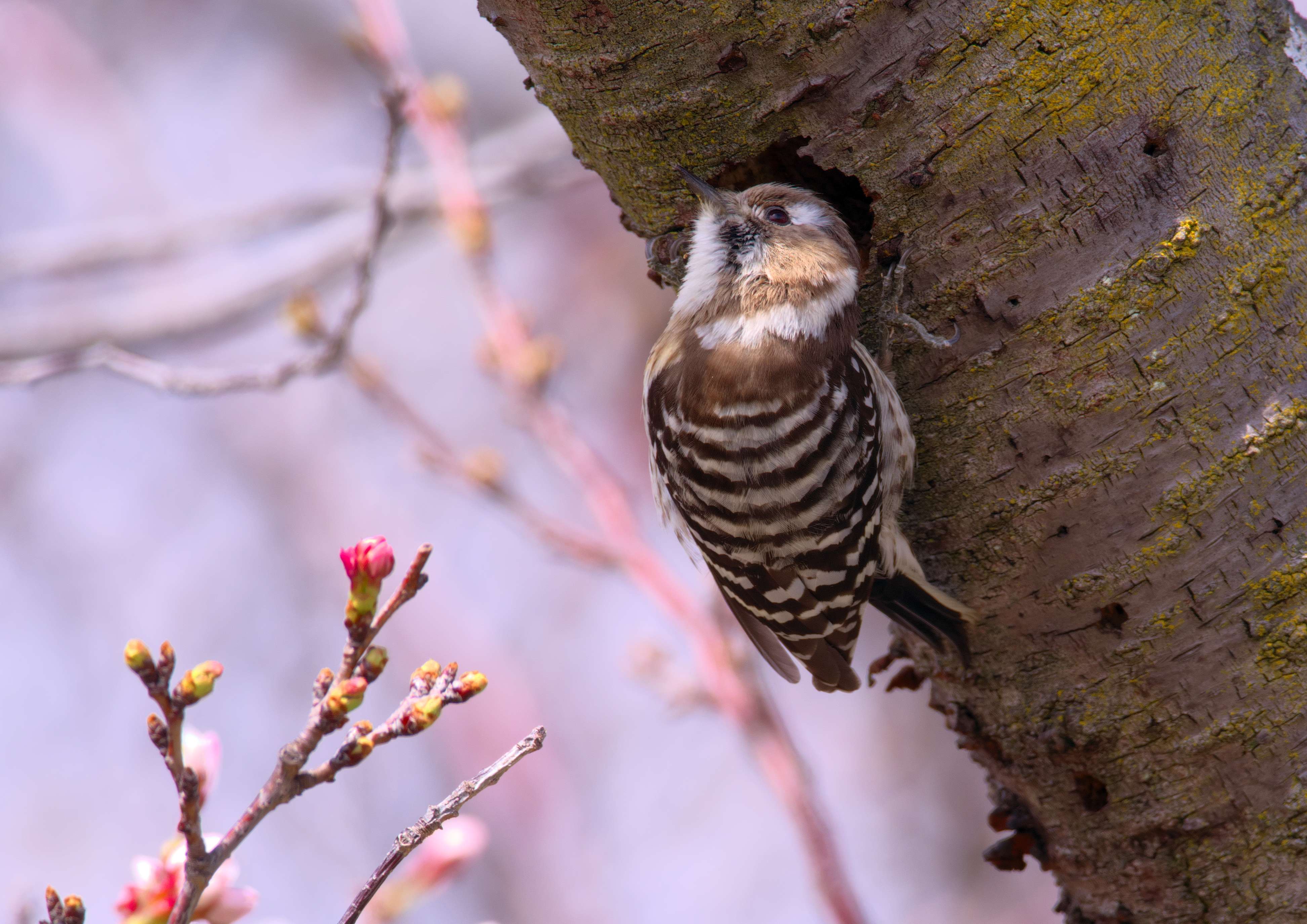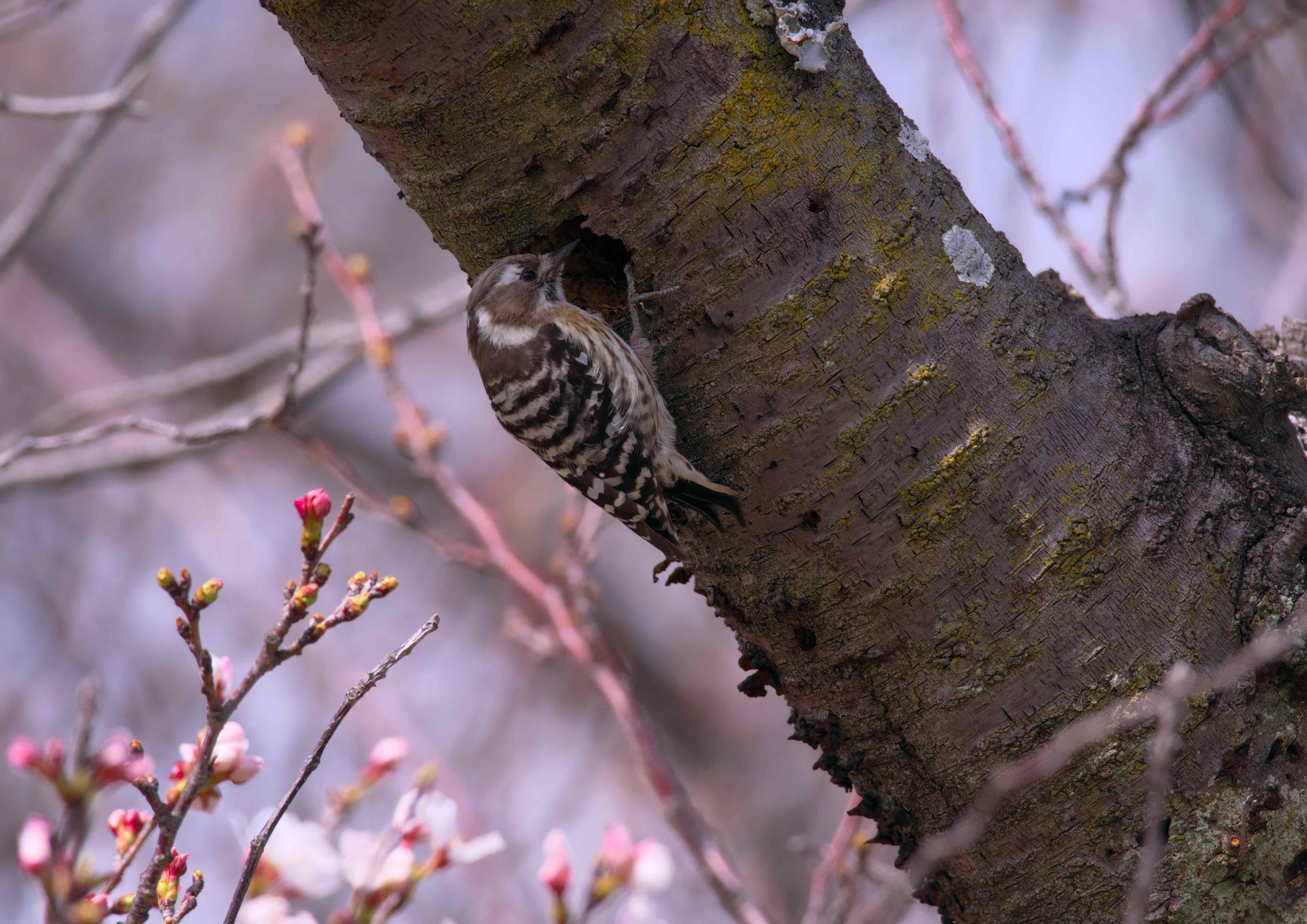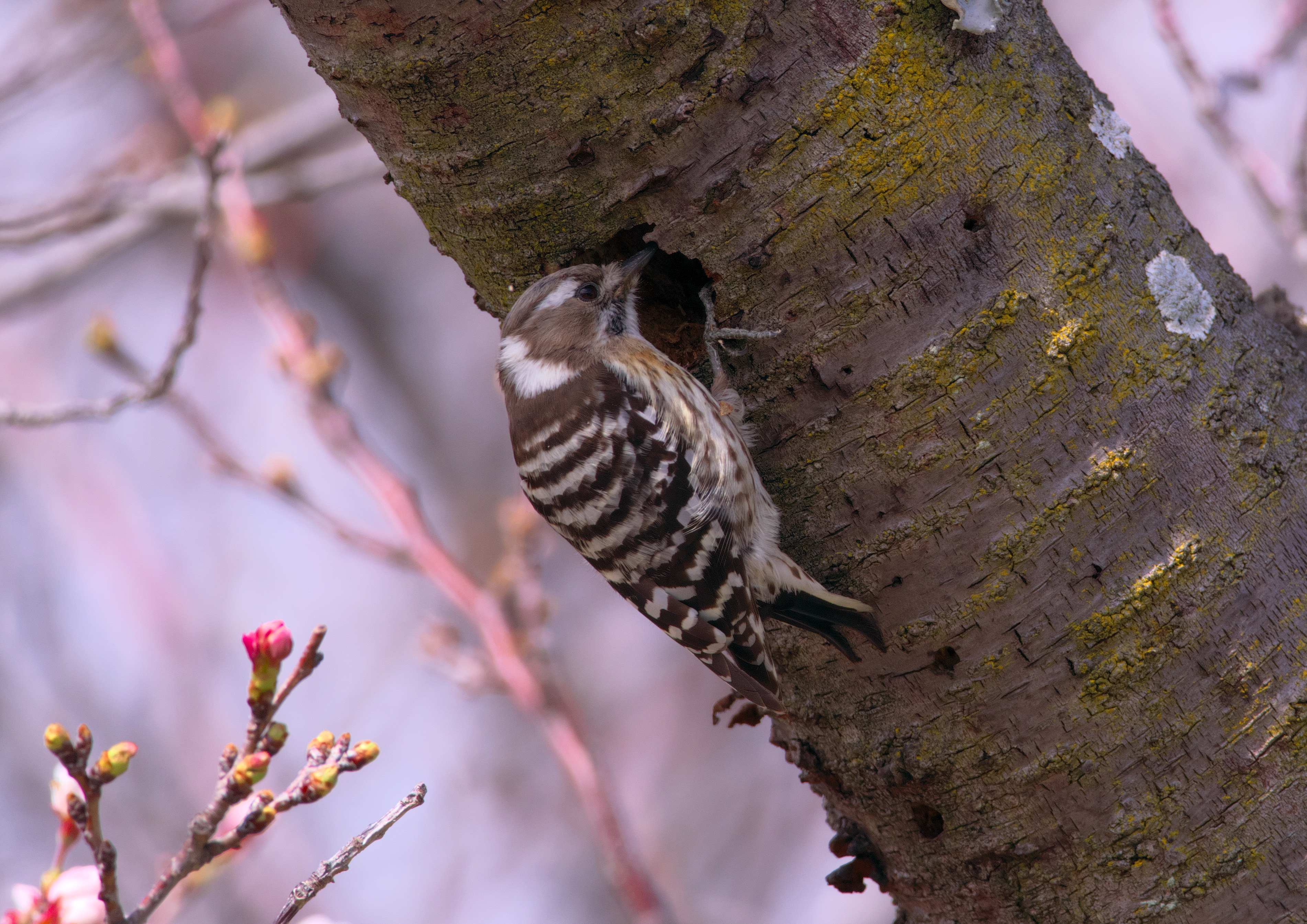 桜の木に突貫工事をしているコゲラを発見。