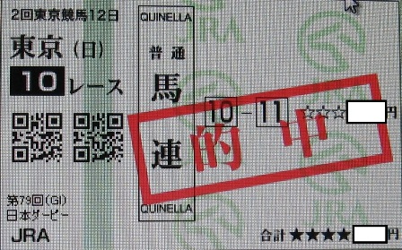 ♪ これから始まる大レース・・・・天下のサラブレッド4歳馬~きょうはダービーめでたいな~♪ 走れ走れフェノーメノ~って、もう決めました。オイラの本命は11番フェノーメノです。現在7番人気です・・・・(^^;)なぜ軸にしない1,2番人気・・・・(--;)東京未経験で本年5走もしているワールドエースはなくても、余裕の使い方のゴールドシップはありそう・・・。 フェノーメノは皐月賞には出走せずにここを目標としたのでしょうね・・・・。そのフェノーメノ・・・・ポルトガル語で超常現象という意味らしいです・・・。超常現象ではりませんが、先週は金環日食で大騒ぎの東京・・・その東京にある競馬場で末脚を爆発させてもらいたいものです。東京競馬場では3戦3勝・・・・人気馬が後方待機となる展開で、好位置から競馬を進められるのはいいですね~(^^)青葉賞を勝った馬は過去に一度もダービーで勝っていないというジンクスがあるのですが・・・そのジンクスを打ち破ってほしいです(^^;)そして、蛯名正義騎手、念願のダービー制覇となってほしいなあ(^^)馬連11流し、相手6、8、17きょうも外れかな・・・・(--;)*********************ディープブリランテ他3頭を買い足しました(^^;)弱っ(恥)なんとか的中です・・・・(苦笑)フェノーメノ・・・蛯名騎手の完璧な騎乗だと思うのですが、やはり展開ってのは難しいのでしょうね・・・。後ろに強い馬がいると思うと、早めには動けないだろうし、そうかと言って前が速い馬場状態ですから・・・・。岩田騎手もよく頑張りました。好騎乗でしたね・・・・。さて、来週は安田記念ですね・・・・。この調子で的中させたいです(^^;)