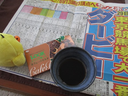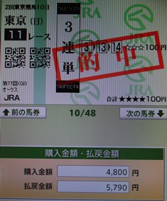 時間前にUPしたと思っていたのですが、更新されてないというか・・・「公開する」を押していなかったみたいで・・・(汗)結果は次のとおりでした。皐月賞1~3着の馬で決まりましたね。オイラは、1,3,8,13の4頭に絞って購入。 馬連フォーメーション1,3-1,3,8,13の5点 三連複軸1頭 1-3,8,13の3点3連単フォーメーション 1,3,8-1,3,8,13-1,3,8,13 の20点 ははは、たまにはこんなこともあります。人気馬での決着でしたから(苦笑) 東京11R・・・8番人気から馬連5点、ワイド3点で・・・的中!やったあ!最終の目黒記念はハズレましたが、プラスで終了!よかったよかった。