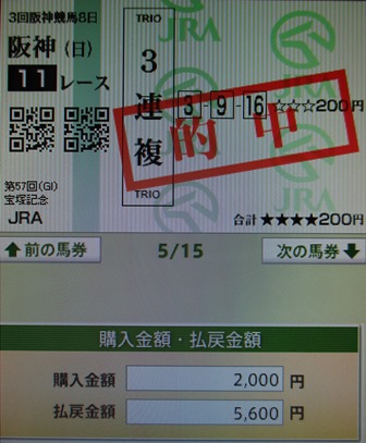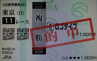 春のG1レースも残すところ、きょうの安田記念と6月26日の宝塚記念を残すのみとなりました。きょうの安田記念は・・・G1レースにしては、少頭数の12頭・・・勝ち目がないという陣営が多かったのかな? 世界ランク3位のモーリスがダントツの1番人気ですが・・・思ったほどの倍率ではないような・・・。現在1.9倍。波乱となるのでしょうか。モーリスは昨年の安田記念から7連勝というすばらしい成績で、もちろん勝ち負けとなるのでしょうね。収支プラスとするならば、モーリスの複勝1点でいいかもしれません。 でも、忙しいマイル戦・・・何が起きるかわからないのが競馬ですよね。昨日は人気のブチコがゲートから逸走し、柵にぶつかって出血・・・。ルメール騎手は骨折し、きょうの安田記念は騎乗できず・・・。 さて、きょうはどんなストーリーとなるのでしょうか。楽しみですね~(^^) オイラは穴馬6番のロゴタイプから買おうと思っています。第66回安田記念・・・6枠6番のロゴタイプ、父ローエングリン 6つながりですね(爆)しかもきょうは6月5日・・・ロゴ ・・・なんです(笑)こんな予想で当たることはないでしょうけど、お祭りですから・・・。 では買い目です。6番複勝1点馬連6番から総流し3連複軸2頭流し 6,8から総流し楽しみましょう! ☆☆☆☆☆☆☆☆☆☆☆☆☆☆☆☆☆☆☆☆☆☆☆こんな予想で…ってことなのですが…的中してしまいましたね(笑)的中してから書くのもイヤミったらしいけど…まあ、来年のために考えをまとめておくかな。実は前走ダービー卿チャレンジトロフィーで2着だったのですが、今回と同じ58キロを背負っての2着でした。しかも、他の競馬場よりは時計のかかる中山で1分32秒台で走ってたということで、ワンチャンスあるかな…と。昨晩の雨で、多少は力のかかる馬場…ってことも味方したし、もちろん田辺騎手の最短コースでの先行策がハマったということでもありますが…。上述のとおり数字の6のサインもあったけどね(笑)予想どおりの的中! 残念ながら100円しか買っていない(汗) 3連複も・・・(苦笑) とりあえず予想どおりの的中でした!追加購入した3連単は万馬券!これで、春のG1シリーズは、宝塚記念で大勝負しない限り、プラス収支で終われそうです(^^)vよかったよかった(^^)