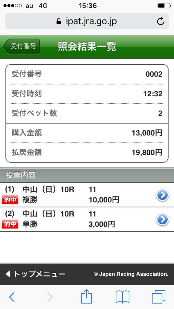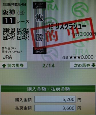 若い女の子たちのレースですね。参考レースを見たけど、おもしろいレースになりそうです。最近はまったく的中しないオイラ理論では、18番リスグラシューが本命。現在2番人気ですね・・・。当たるかな?では当たらない買い目は・・・18番リスグラシューの単複3連単2頭軸 2,18-2,18-8,11,17複勝くらいは的中してほしいですね・・・(汗)*****************************************複勝だけ的中で・・・トリマイ(汗)オイラの場合は、やはり複勝1点勝負が基本かなあ・・・締め切り間際に追加で馬連1点購入・・・。よかったです(笑)