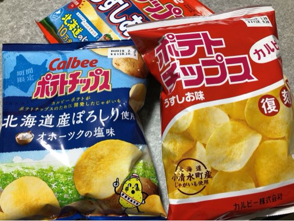 某ポテチ会社の戦略にハマり… 10月8日に販売開始された2種類の新商品を購入してしまった…(苦笑) 一つは、北海道産ぽろしりという品種、そしてオホーツクの塩を使用した商品。 そしてもう一つは、ポテチ発祥の地、小清水町開町100年を記念し、小清水町産ジャガイモを使用した復刻版。 何がどう違うのか知りたい…。 見た目…うーん…(-_-) 食べてみた。 食感、塩味… うーん…(-_-) 全部同じ? 味の違いを見分けるのに根拠のない自信があったのだけど… 無念…(-_-) 違いはパッケージだけのような気がしました(苦笑)