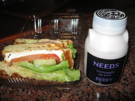「ナチュラル・ココ」さんの飲むチーズ(262円)と「しんむら牧場」さんのチーズワッフルサンド(300円)。