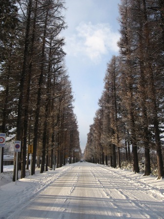 中途半端な積雪で、カラマツ並木もイマイチの風景だ・・・・。