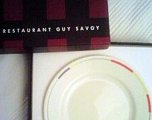 昨日は今パリご滞在中の知り合いのご夫婦のお供で「GUY SAVOY」に行ってきた。サービスが過剰なんて噂も聞いていたけど、確かにサービス係がずらっと両側に並んでのお出迎えはちょっと照れる(笑)。入り口はとても地味。見落としそうなくらい。でもタクシーが止まったとたんに、あれよあれよと店内に案内される。内装はモダン。フォーシーズンやクリヨンなんかの豪華さとくらべるとかなり地味目。席に着いてすぐ、女性客だけにプレゼントされる、特製の小さなお皿をいただく。そして早速シェフのGUY SAVOYが出てきて挨拶してくれた。写真のままの抜群の笑顔で、ちょっとシャイな感じ?ソムリエがすごく若い。押し付けがましくなく、でもちゃんとアドバイスしてくれる。さすが。3つくらいのサロンに分かれている店内は案外テーブルの間隔が狭く、そこにたくさんのサービス係がいるのでかなり窮屈そう。それでもぶつかったりもせず、ちゃんとお客さんを優先している身のこなしもさすがだ。全体的に仰々しい感じがせず、とても自然な笑顔と自然なサービスが居心地良かった。これなら3つ星が初めて!という、シャイな日本の人でも緊張せずに済みそう。お料理はヌーベル・キュイジーヌというのか、量はかなり控えめ。これならしっかり全部食べられる。盛り付けがやはりモダンな感じでいちいち感動してしまった。チーズがとってもおいしそうだったけど、ご夫婦がもう食べられないというので残念ながら私も辞退。しかし次から次へと出てくるミニャルディーズのすごい事。受け取るばかりでなかなか食べられなかったりして。料理もデザートも優しい味付けで、これも日本人好み。相当グルメなご主人も大満足だった様だ。会計を頼むと同時に「タクシーも呼びましょうか?」ときた。すばらしいわー、ちゃんとタクシーで来た事をチェックしていたんでしょうね。もうこの一場面で完全にこのレストランのファンになってしまった(笑)。やっぱりお供だとなかなか思う存分は楽しめないので今度は自分でぜひ来たい!そろそろ豪華ランチしたいよねーと話していたIちゃんに電話してこんどのランチはここに決定。ランチのお得なセットメニューは一日1テーブルだけらしいので早目に日を決めて予約しないとね。