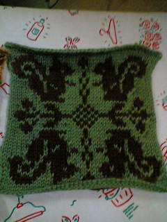 見かけによらず編み物好きです。でも大物はもう根性がありません・・・増やし目減らし目が嫌いです。。。ゲージを取るのも嫌いです・・・すぐあきます(最低だね(笑))とにかく黙々と普通に編んでるのが無我の境地で(笑)好きなんです毎年マフラーはいりません・・ひざ掛けはフリースのほうが暖かいしショールはパシュミナのほうが軽くてかさばらない昔はだからしょうがないからセーターとかカーディガンを編んでましたが最近は大物を作ると完成しないんですでも時々(冬になると)無性に編み物がしたくなります。(単なるわがまま)ところが先日新聞チラシにフェリシモの広告が入っていてこんな私にぴったりの編み物がありました。なつかしさをつないで はじめてさんにもできる棒針モチーフ編みの会45目×47段の模様編みを編むだけ・・・編んだら終わり(笑)すごく気楽・・すぐできるし(笑)値段も手ごろで、完成品丁度お正月休みが4日間あったのでその間に編みました。表あみと裏あみだけで編めるさすがにはじめてさんにも編めると銘打つだけあって上のリスの編みこみでも色替えを「緑1、茶2、緑1、茶3・・」と丁寧に目数も数えないでもすむくらいいたれりつくせり・・アイロンのかけ方が甘いのでちょっと丸まってます(笑)(背景はアイロン台)会社の友人が他のフェリシモを毎月購入しているので送料を浮かせるために一緒に頼んでもらいました。毎月2種類の模様と毛糸が6種類。出来上がる作品は20×20の正方形4か月(8枚)分でクッションなら完成だし沢山つなげればおこたカバーとかベットカバーもできるって話。その前に夏が来るので絶対にそこまでは行き着かないと思うけどとりあえず今は久々の達成感以上今回は男性の方には全然関係のない話でした