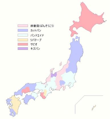 東海地方では傷にはる絆創膏の名前は「バンドエイド」「ちょっとバンドエイド取って すりむいちゃった」「ママ~ バンドエイド貼って」全国的にそういうものはバンドエイドと呼ばれていると思っていたと・・・ところが県によって呼び方が違うんだそうです 絆創膏とそのまんま呼ぶのが: 石川県、福井県、新潟県、長野県、静岡県カットバン: 青森県、岩手県、秋田県、宮城県、山形県、福島県、山梨県、岡山県、鳥取県、島根県、山口県、愛媛県、高知県、長崎県、鹿児島県 新カットバン.A 10入 【第3類医薬品】バンドエイド: 栃木県、茨城県、千葉県、群馬県、埼玉県、東京都、神奈川県、岐阜県、愛知県、三重県、大阪府、滋賀県、京都府、兵庫県、香川県、徳島県 J&J バンドエイド 肌色タイプ10枚入 (1616-0403)リバテープ: 奈良県、福岡県、佐賀県、大分県、熊本県、宮崎県、沖縄県3~5営業日で発送キズリバテープ半透明タイプ スタンダード10枚サビオ: 北海道、奈良県、広島県絆創膏(サビオ)♪USAVICH(ウサビッチ)ウサビッチ ばんそうこう【フェイスカット】キズバン: 富山県【メール便対応】ライト ライトキズバン(10枚) G-154ウィキペディア先生によると「一般に「バンドエイド」の語をもって絆創膏を指すことも多い」そうですがどれもみな商品名が地域の呼び名になっているようです多分その地方に行くとドラッグストアの一番売り場面積の多いのはその絆創膏なんだろうねそう言えば・・・・セロテープは実は商品名ですが誰も「セロハンテープ」とは呼びませんホッチキスも実は商品名ですが誰も「ステープラ」とは呼びませんエスカレーターはオーチス社の商標ですが誰も「階段式昇降機」とは・・・・・呼ばんわなぁ戦後の野球じゃないんだからしかし・・・義父はバンドエイドの事を「リバテープ」と呼んでました義父は静岡の出身ですなんでなんだろうおかしいなぁ「おい リバテープ取ってくれ」「はぁ」「リバテープも知らんのか」とあきれられました知らんわけがをしたとき「キズバン ちょうだい」って言ってしまったら「あんた富山県民だね」ってバーテンダーに当てられますよ (by 秘密のケンミンSHOWの「ケンミンの見抜き方」)