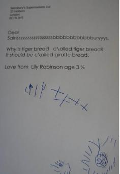 イギリスで3歳のリリーちゃんから送られた手紙にお店の人がお返事をくれましたリリーちゃんのの手紙Sainsssssssssssssssssbbbbbbbburyyy's さんへ(Sainsbury's:イギリスの大手スーパーマーケット)どうしてタイガーパンはタイガーパンなの?キリンパンのほうがいいと思うのリリー ロビンソン(3歳1/3) 彼女の直筆は多分右下のミノムシさんそして自分で打ち込んだのは宛名sssssssssだけかなで・・・これがTiger Bread なるほど・・・キリンパン・・もしくはヒョウパンだそんなリリーちゃんにお店からは「お手紙をどうもありがとう。タイガーパンの名前をキリンパンにするアイデアはとてもすばらしいと思います。トラのしま模様よりは確かにキリンのまだら模様に見えますね。タイガーパンと呼ばれる理由は、むかーーし、初めてこのパンを作ったパン屋さんがこれがトラに見えると思ったからなのだと思います。ちょっとおかしいですね。とにかくあなたのお手紙が気に入ったので3ポンドのギフトカードをプレゼントとして送ることにしました。セインズベリーのスーパーに連れていってくれるように、お父さんかお母さんに頼めば、これでタイガーパンが買えます。(それからお母さんがいいと言えば、お菓子も買えます)。大人にはこのカードを使うまで48時間待つように伝えてくださいね。手紙をどうもありがとう。またお店で会いましょう。クリス・キング(27歳&1/3)カスタマー・マネージャー」というお返事が来たそうですう~ん・・・この返事の仕方 年齢の返し方といい・・・やるじゃんトラのパン・・・トラのパン・・・・トラのパンツはしましまパンツ~がんばらなくっちゃ~がんばらなくっちゃ