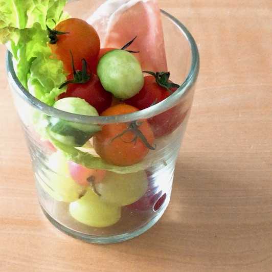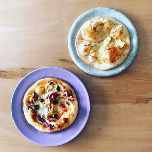 ベーコンのピザ、りんごのピザ、トマトとぶどうのサラダハート