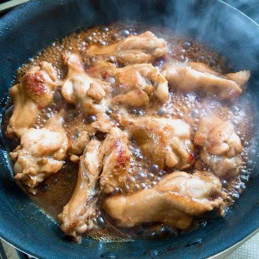 (2)☆を加え中火で煮汁がほとんどなくなるまで煮る。黒胡椒をふる。