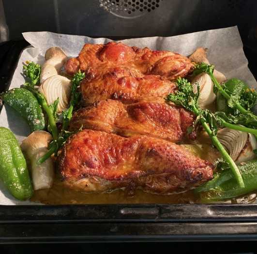 (2)オーブンを200℃に予熱し、天板にクッキングシートを敷いて(1)とあれば付け合せも並べ、20~25分焼く。
