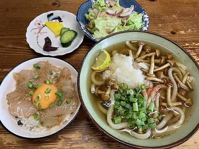 温かいうどんで今回は、なめこおろしうどんにしました。刺身用の鯛があったので、薄切り…