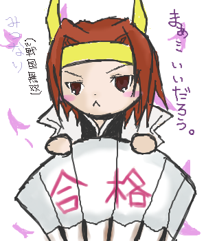 うはーやっぱ授業はめんどいの☆ども、昨日のテスト4教科もかえってきて絶望的なラルですゎ^^点数やっばーwwww受験生がとるような点数じゃないよあんなのwwwwwwwま、私 もとからお馬鹿さんだし、、、ってかホントBASARAまじ今人気?Nちゃんにまで今日やりたいっていわれた。土智、Nちゃん、haderuが今やりたがってる人カナー。Nちゃんは家近いからいいとして…。ま、そんな私も最近母と姉に取られてる。私がPS2もソフトも自分で買ったのに勝手にやるお二人さん。ちょ、おまっwwwwwwww私の貴重な時間盗むんじゃなぃよwwwww確か明日5時間授業だったきがwwwwwwやったネ☆★のんびぃ~りできますぞいb最近絵を中々かかない私だが暇すぎていろいろちょびちょびカキカキ…。何かリクエストないですk(ryいかんいかんwwwwリクエスト受けてもかけるキャラ全然いないから話になんねぇよ←