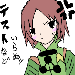 はい、中学最後のテスト(受験抜き)が明日からはじまるねぇめんどくさ・・・つか、もう真面目に絵をかく気ねぇ・・・小3レベルの絵をたくさんかこう・・・。あ、上と下のナリ様ネ。今じゃ一番好き。
