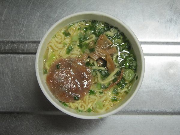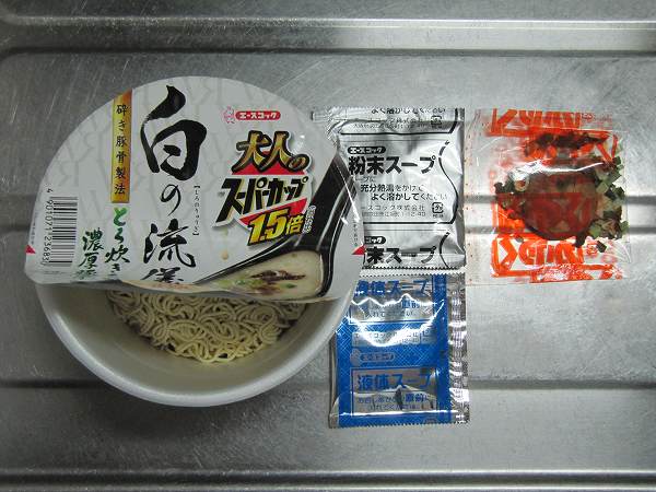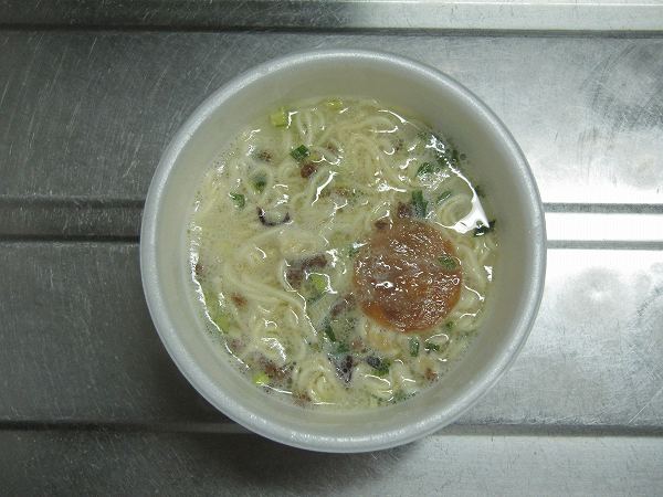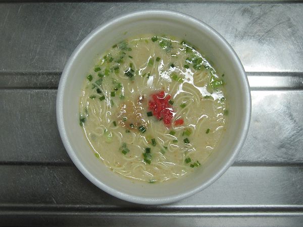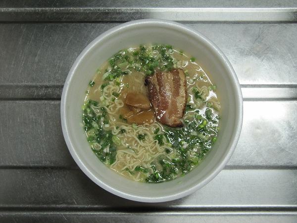お湯を入れて3分、液体スープを入れてよくかき混ぜてからレトルト調理品とあとのせかやくを入れたら完成。豚骨特有の香りとともに長ネギの良い香りもしてきました。