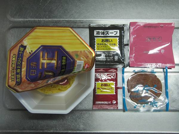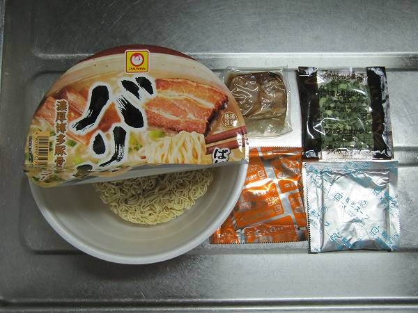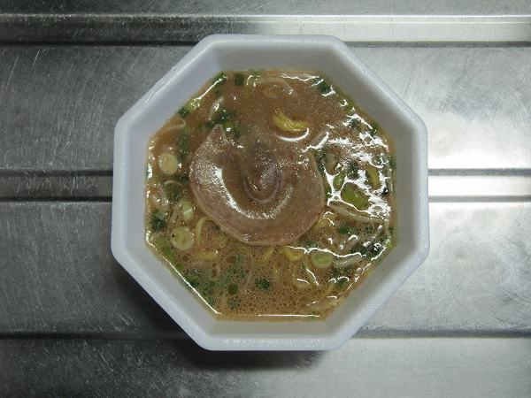 お湯を入れて5分、蓋を開けて粉末スープと液体スープを入れてよくかき混ぜれば完成。豚骨特有の香りはそれほどでもなく醤油と香辛料の食欲をそそる香りがしました。