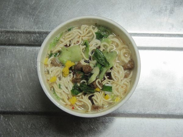 お湯を入れて3分、蓋を開けて液体スープと調味油を入れてよくかき混ぜれば完成。豚骨と煮干しのダブルの香りがしてきますがどちらかといえば煮干しの方が強いです。
