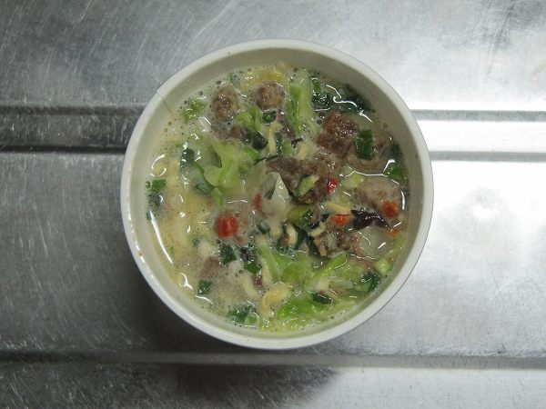 具は挽肉、タマゴ、チンゲンサイ、唐辛子、ゴマ、長ネギの6種類となっており、挽肉は薄めの味付けとなっていて食べやすく、チンゲンサイはシャキッとした食感です。
