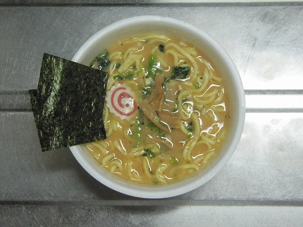 お湯を入れて4分、蓋を開けて液体スープを入れてよくかき混ぜてから焼き海苔を添えれば完成。豚骨エキスの良い香りが漂うとともに焼き海苔の良い香りもしてきます。