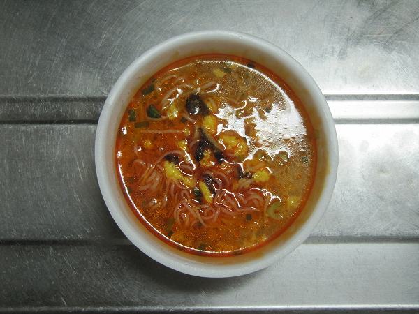 お湯を入れて3分、蓋を開けて液体スープを入れてよくかき混ぜれば完成。ゴマの風味がそんなにしてこないのが残念ですが辛そうな香りはなかなか良い感じですね。