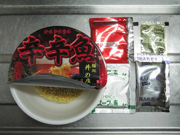 お湯を入れて4分、蓋を開けて液体スープを入れてよくかき混ぜてから後入れ粉末スープを入れ、最後に焼き海苔を乗せれば完成。魚介と唐辛子の香りがしてきました。