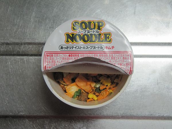 お湯を入れて3分、蓋を開けてよくかき混ぜれば完成。キムチの食欲をそそるような香りがしてくるとともに、スープヌードルということでタップリスープが入ってます。