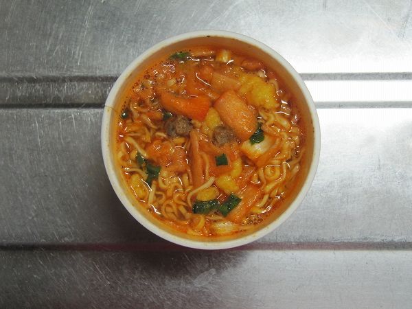 お湯を入れて4分、蓋を開けてよくかき混ぜれば完成。鼻を近づけたら何か違った香りがしてくるのかと思ったのですが、遠くても近くても唐辛子の香りがしてきました。