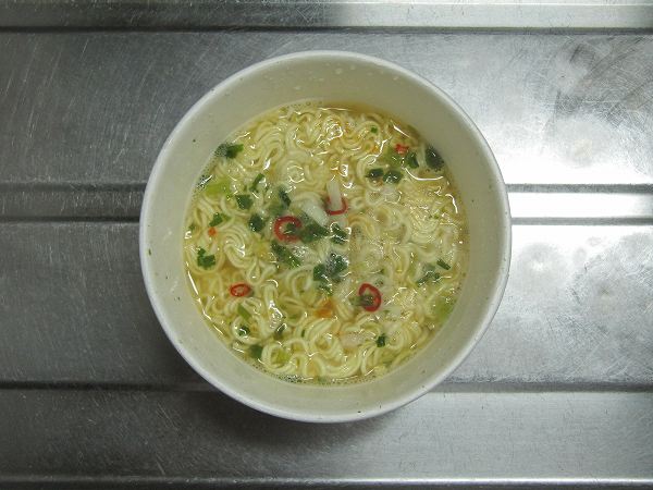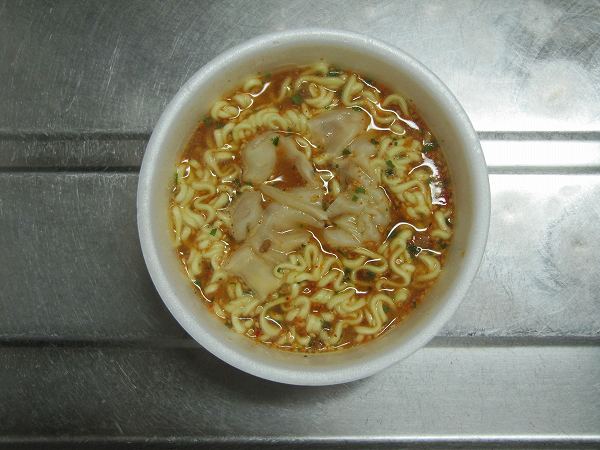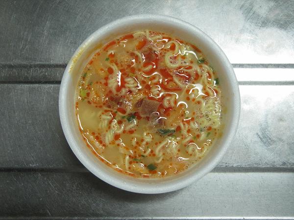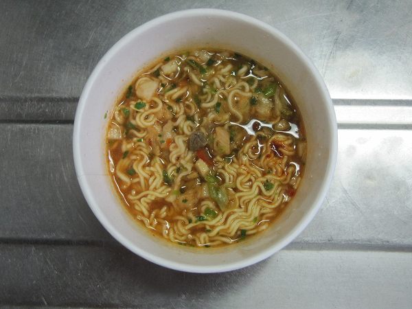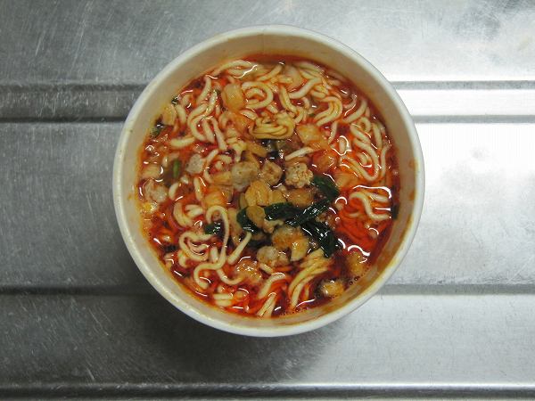 お湯を入れて4分、蓋を開けてよくかき混ぜれば完成。鼻を近づけると解るくらいの唐辛子をベースにした香りがしてくるような気もしますが鶏ガラの風味も解ります。